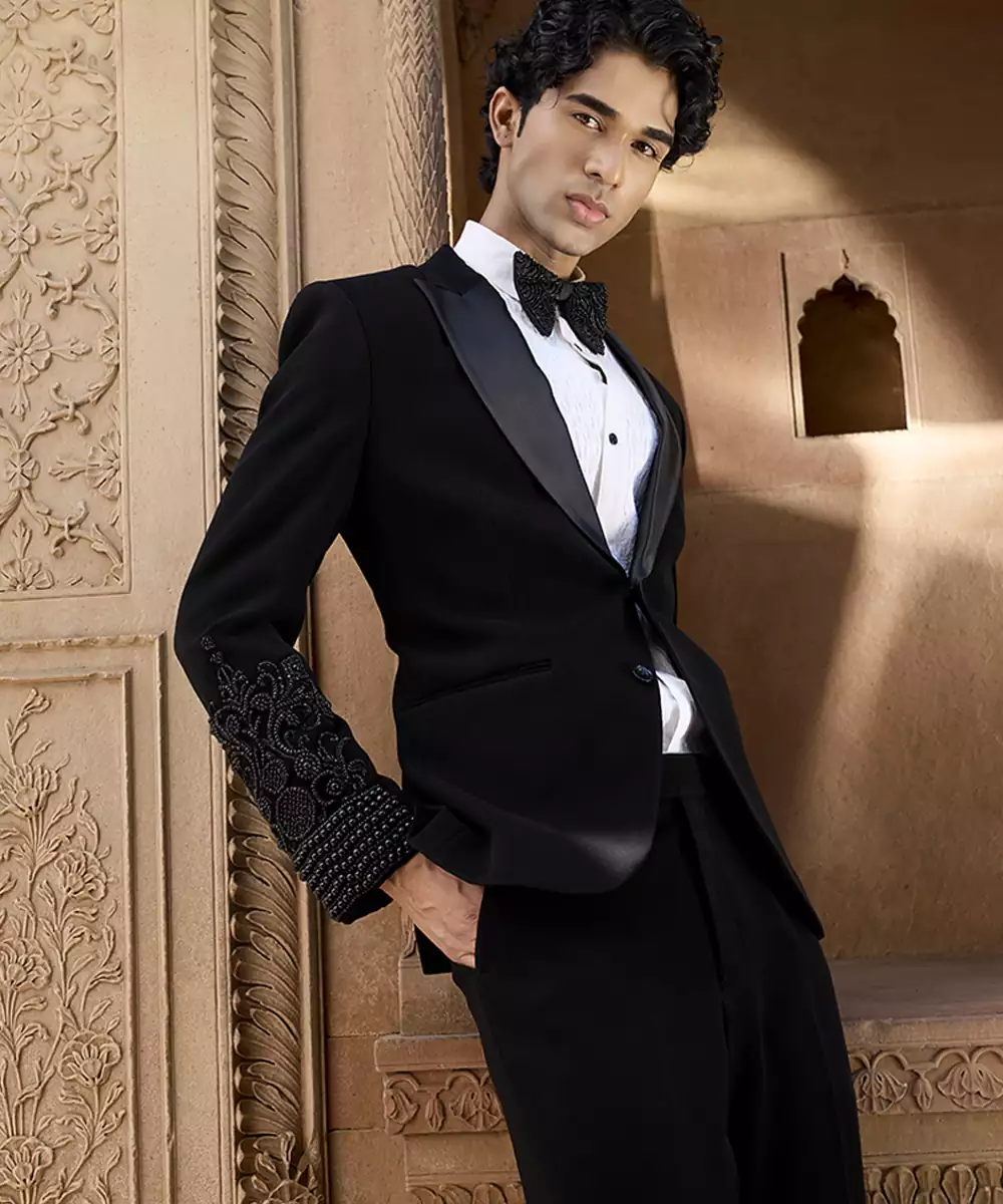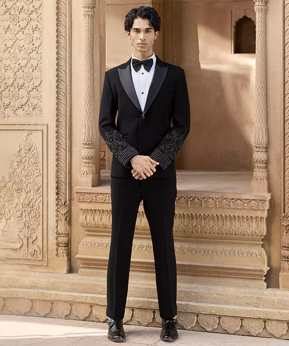 This Black Tuxedo Crafted In Crepe Silk Features Delicate Embroidery For A Smooth And Elegant Finish. The Fluid Texture And Structured Tailoring Combine Comfort With Sophistication, Making It Suitable For Evening Receptions And Modern Formal Occasions.