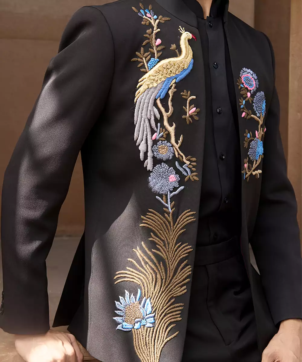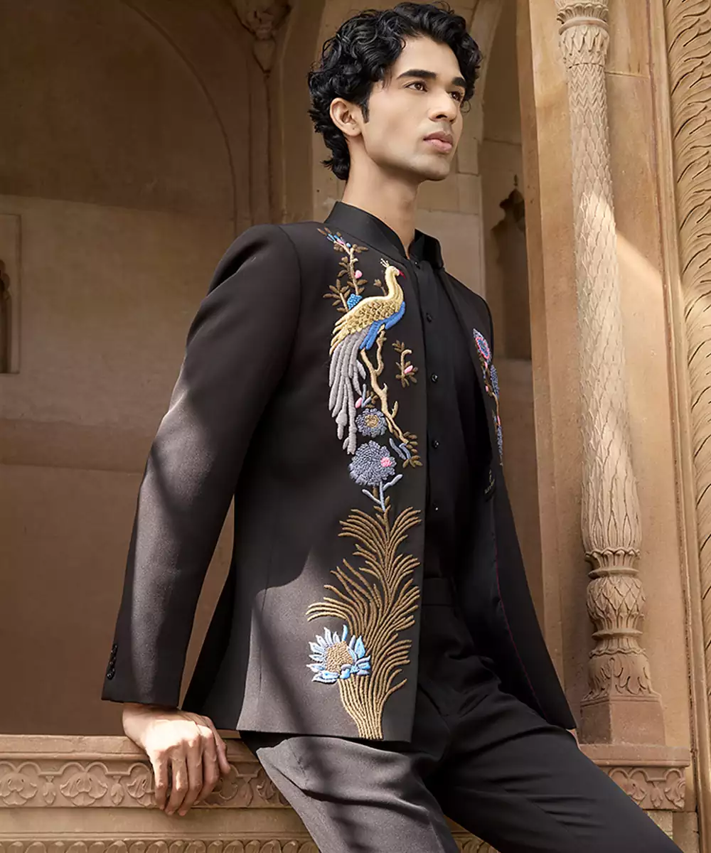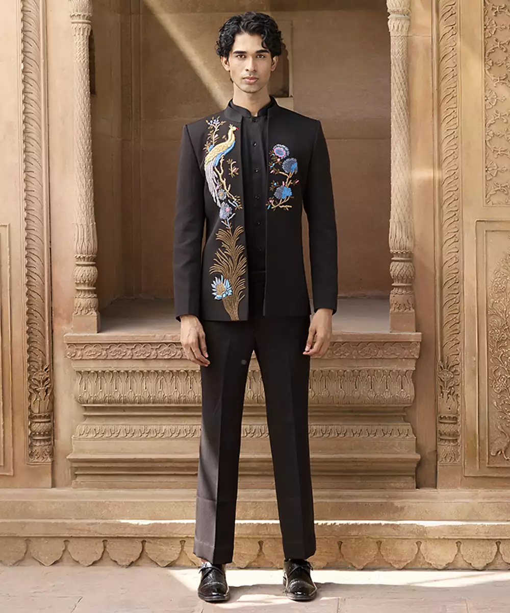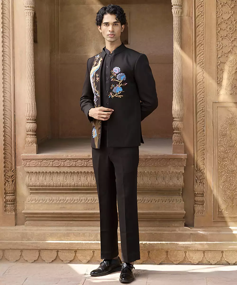 A Black Linen Bandhgala Set Highlighted With Elegant Embroidery For A Contemporary Festive Appeal. The Lightweight Fabric And Sharp Tailoring Ensure Comfort And Sophistication, Perfect For Weddings And Celebratory Evenings.