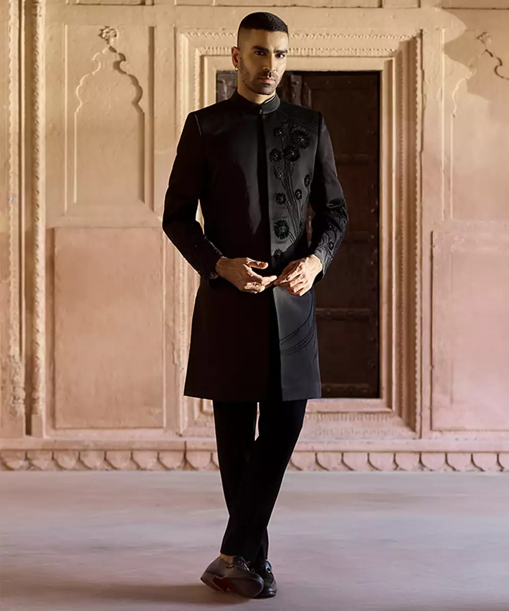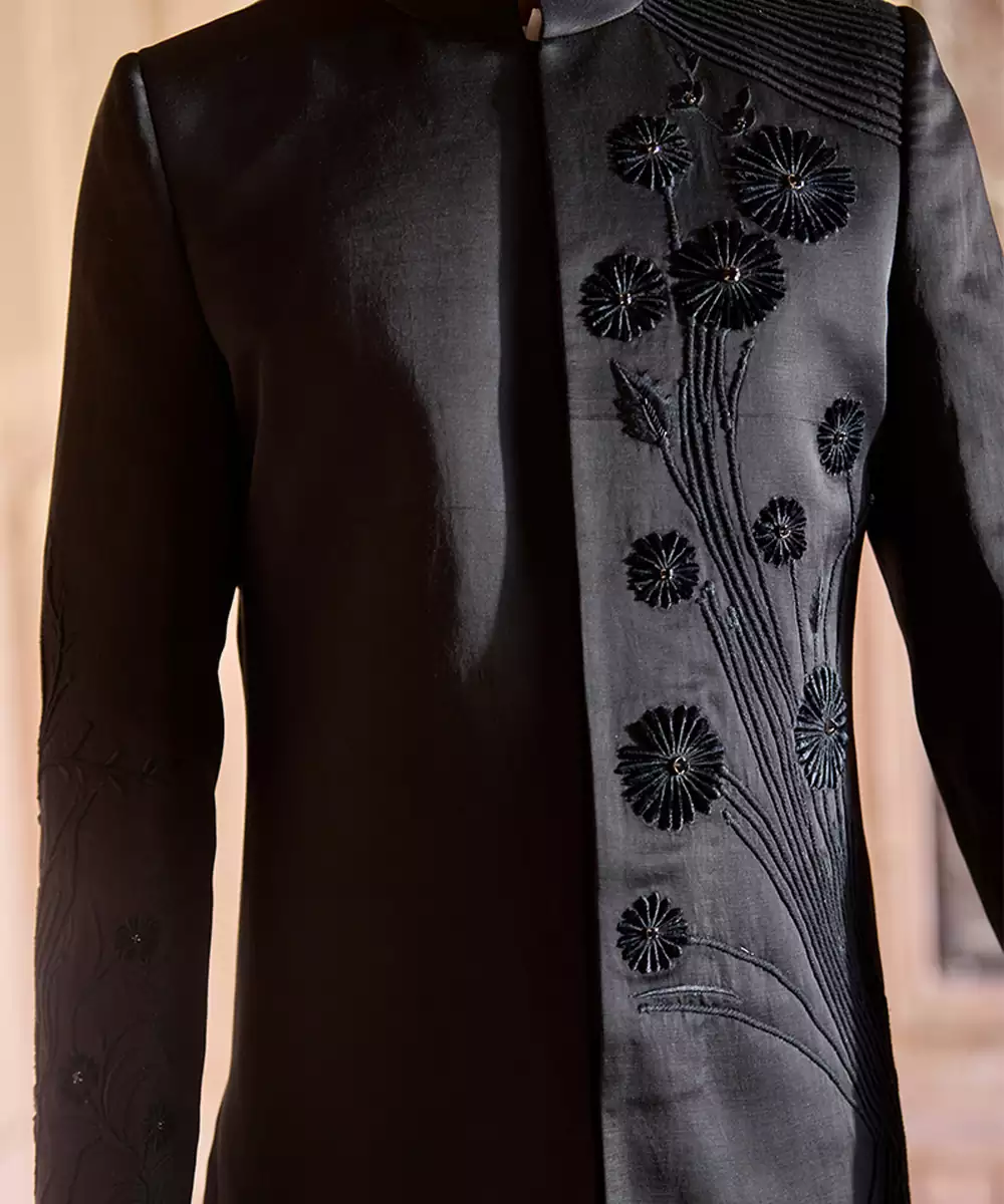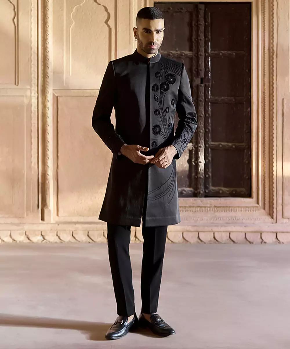 A Black Linen Indowestern Set Adorned With Refined Embroidery For A Sleek Festive Appeal. The Breathable Fabric And Tailored Silhouette Ensure Comfort And Polish, Making It Suitable For Weddings And Celebratory Occasions With Modern Ethnic Charm.