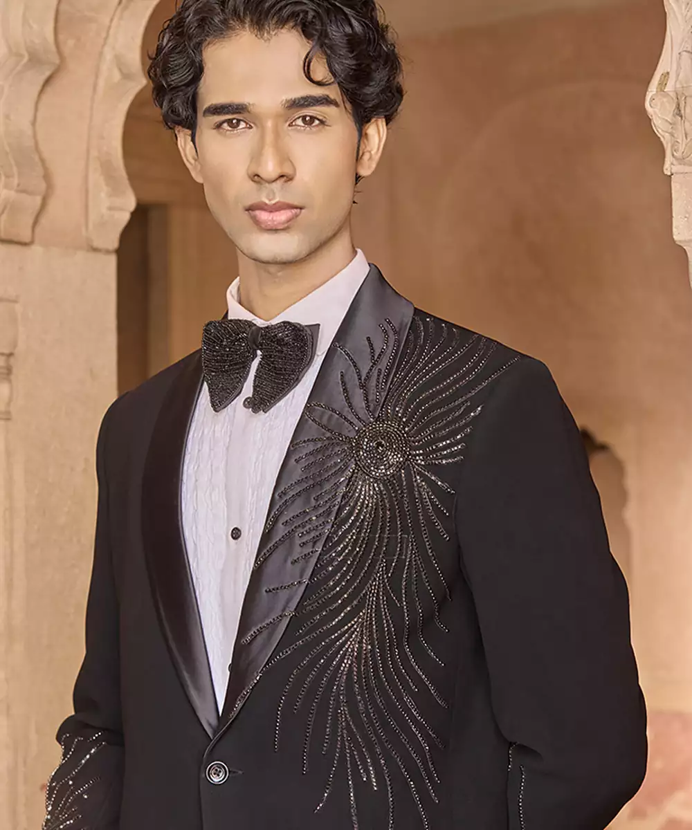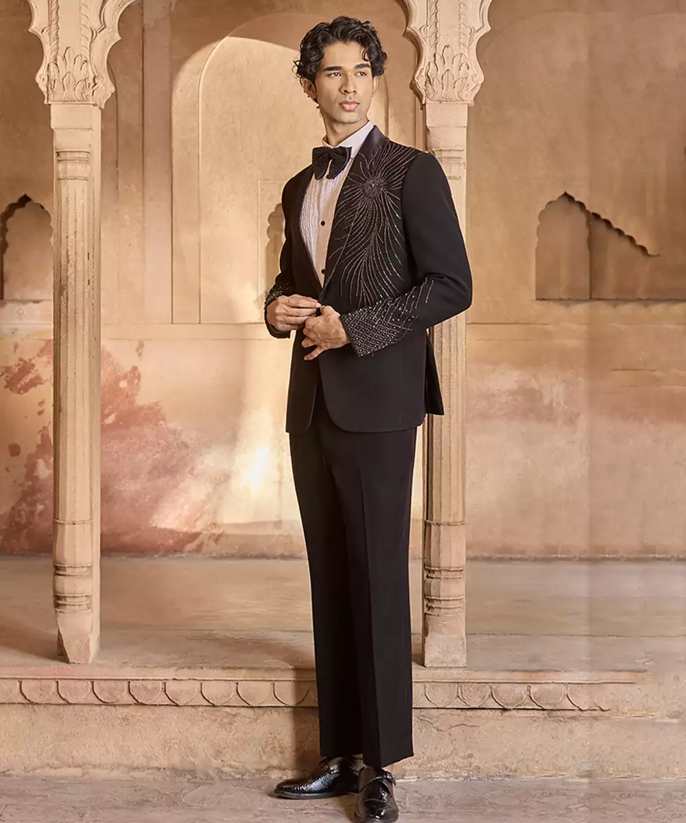 A Black Velvet Tuxedo Featuring Intricate Embroidery For A Luxurious Formal Statement. The Plush Fabric And Sharp Tailoring Create A Commanding Silhouette, Perfect For Receptions And Evening Celebrations Where Elegance And Opulence Are Desired.