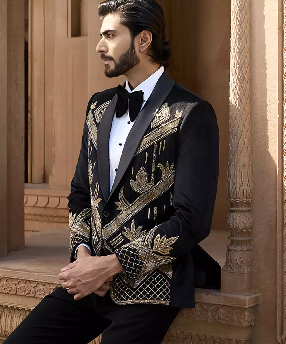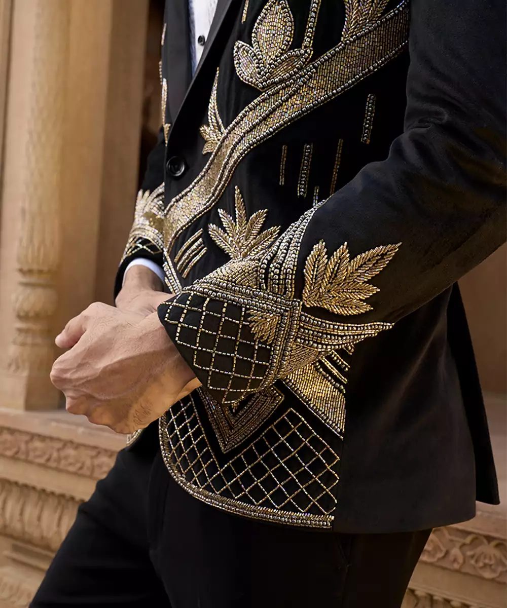 A Statement Black Velvet Tuxedo Detailed With Intricate Embroidery For A Majestic Formal Look. The Luxurious Fabric And Crisp Tailoring Ensure A Polished Appearance, Perfect For Receptions And Ceremonial Gatherings.