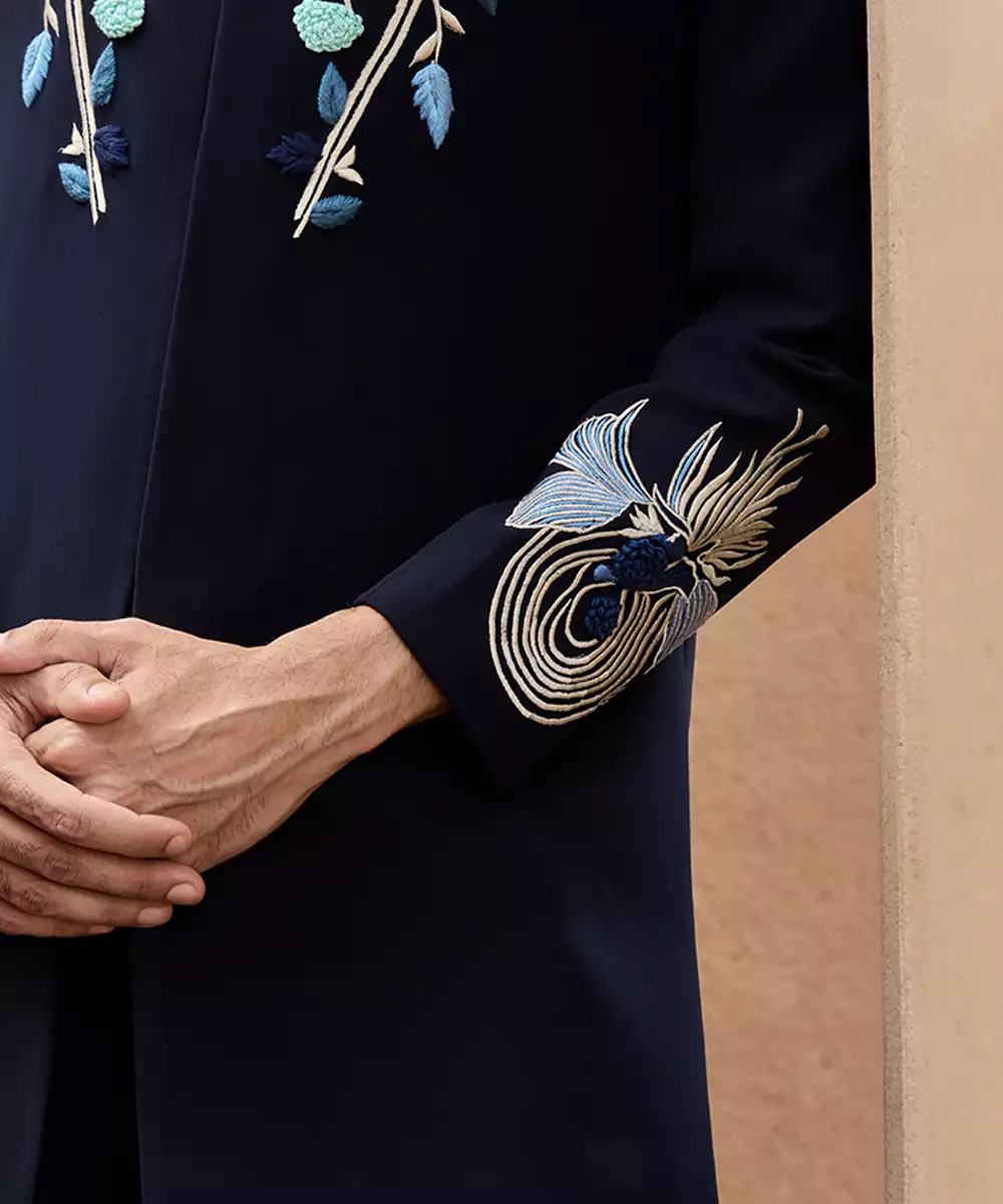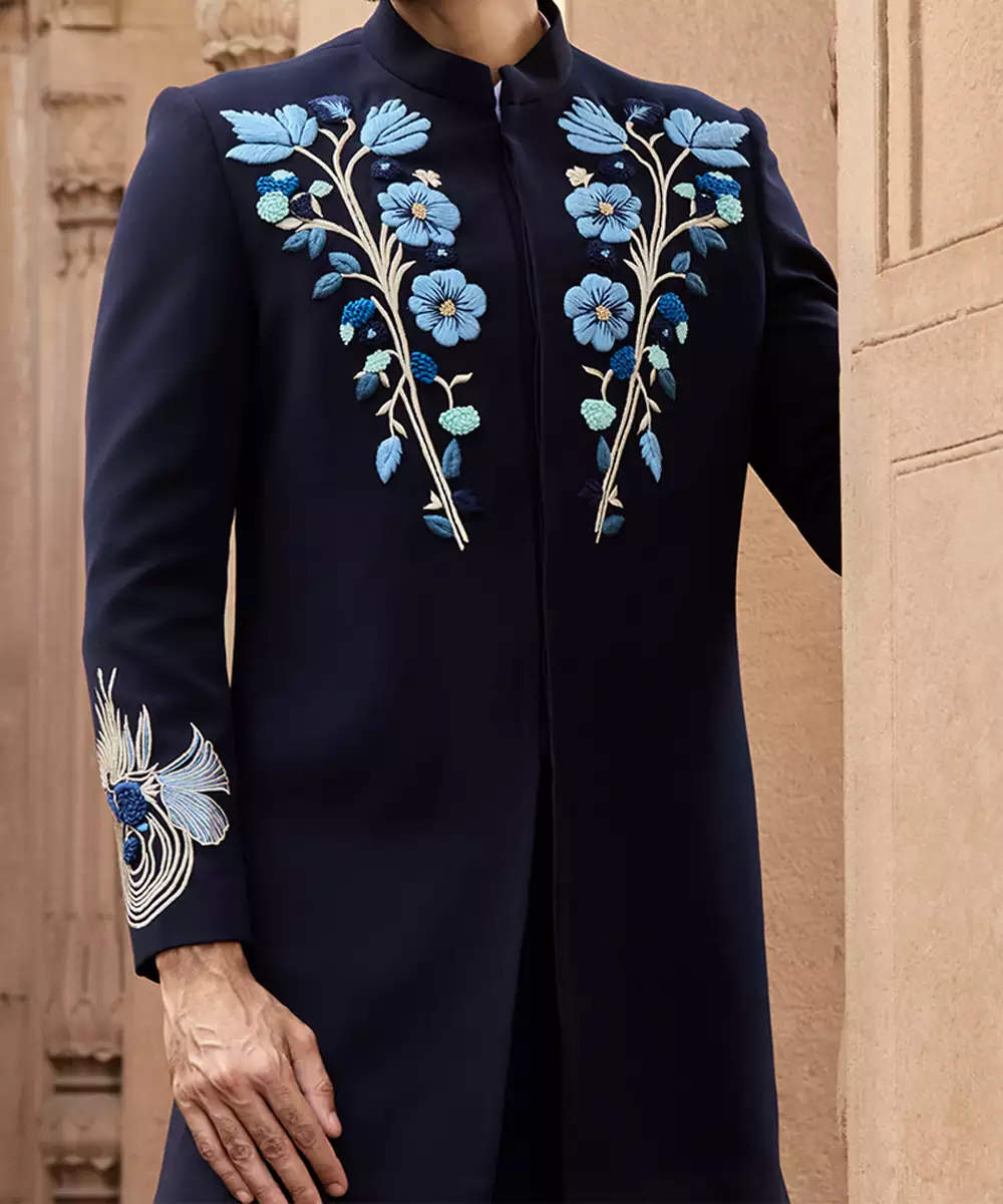A Blue Linen Bandhgala Set Accented With Intricate Embroidery For A Refined Formal Appeal. The Clean Tailoring And Breathable Fabric Create A Polished Silhouette, Perfect For Festive Events And Cultural Celebrations Requiring Understated Sophistication And Comfort.