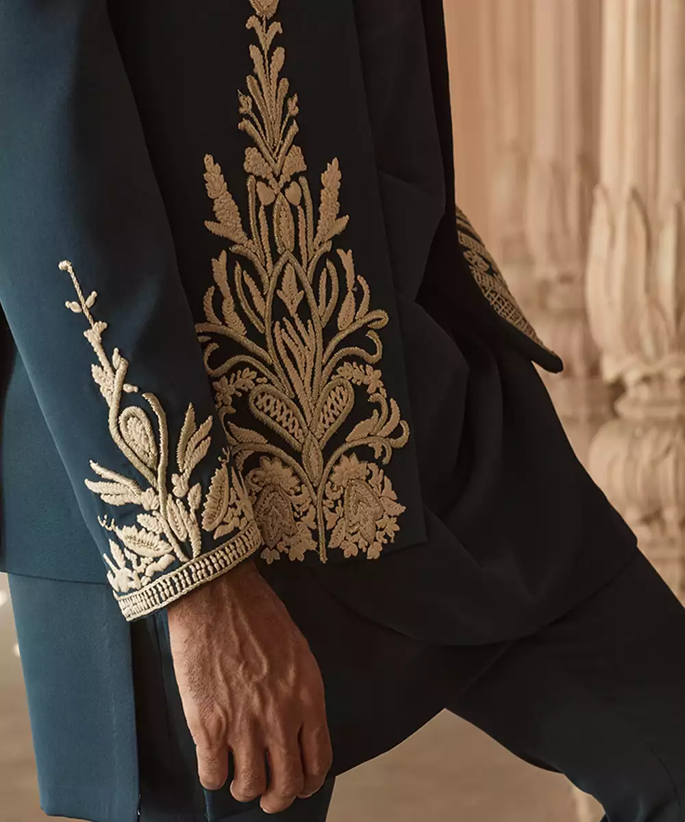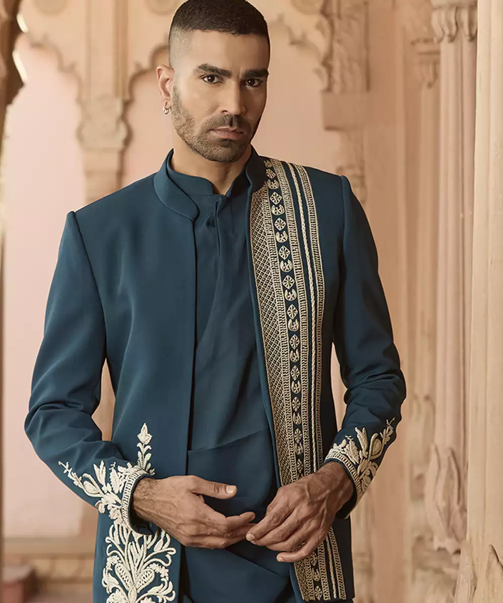 This Blue Indowestern Set In Linen Is Enhanced With Fine Embroidery For A Smart Festive Finish. The Structured Silhouette And Lightweight Texture Offer Comfort With Style, Making It Ideal For Wedding Functions And Celebratory Gatherings With A Contemporary Ethnic Twist.