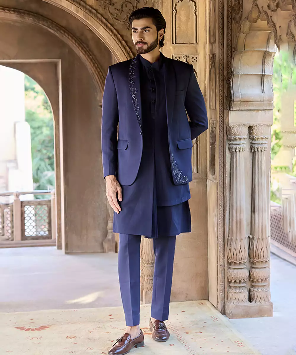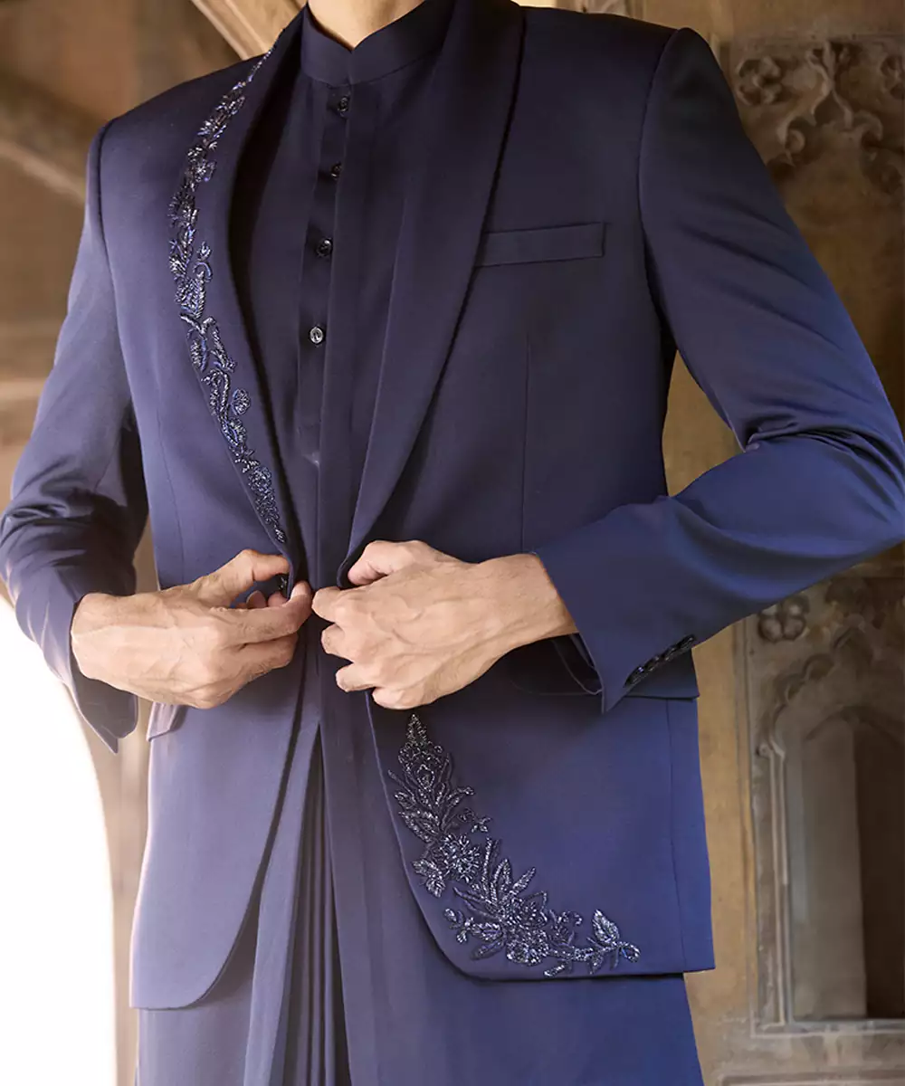 This Blue Linen Indowestern Set Showcases Delicate Embroidery That Elevates Its Contemporary Silhouette. The Airy Texture And Clean Tailoring Make It A Stylish And Comfortable Option For Festive Gatherings And Wedding Events With A Modern Traditional Vibe.