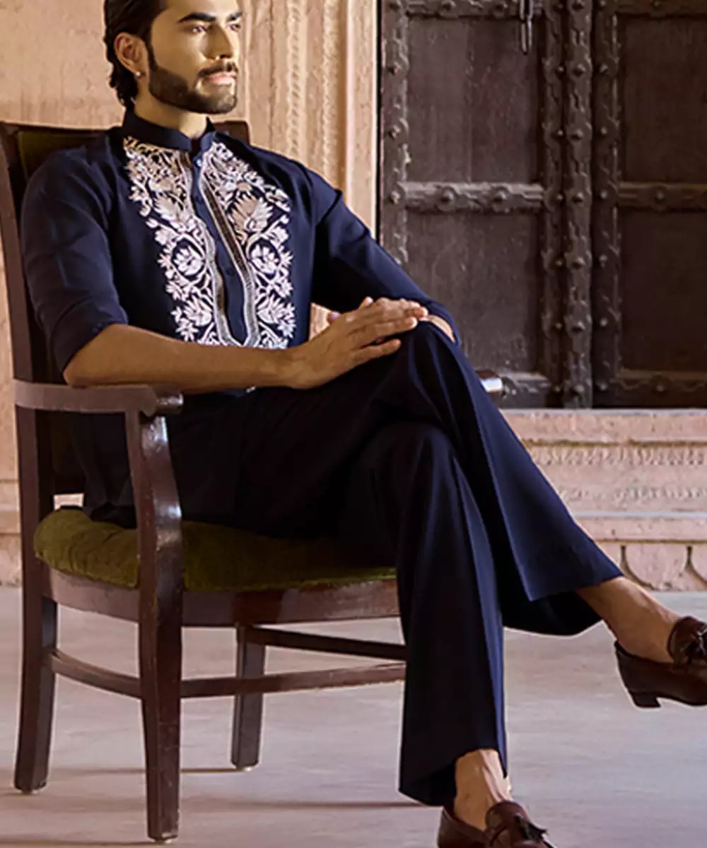 This Blue Linen Kurta Set Is Accented With Intricate Embroidery For A Fresh Festive Presence. The Lightweight Fabric And Classic Cut Offer Comfort And Elegance, Ideal For Weddings And Traditional Occasions.