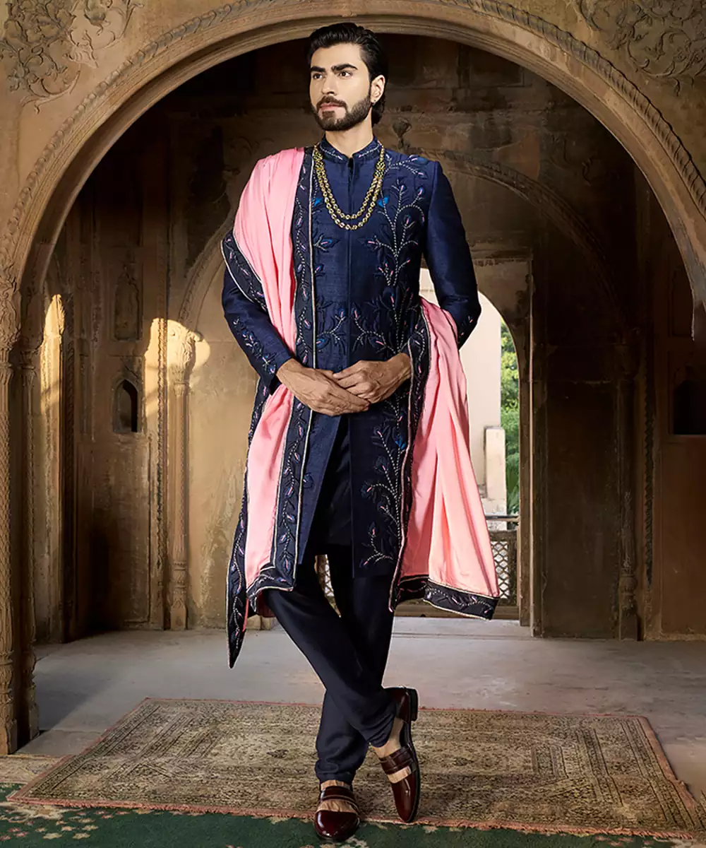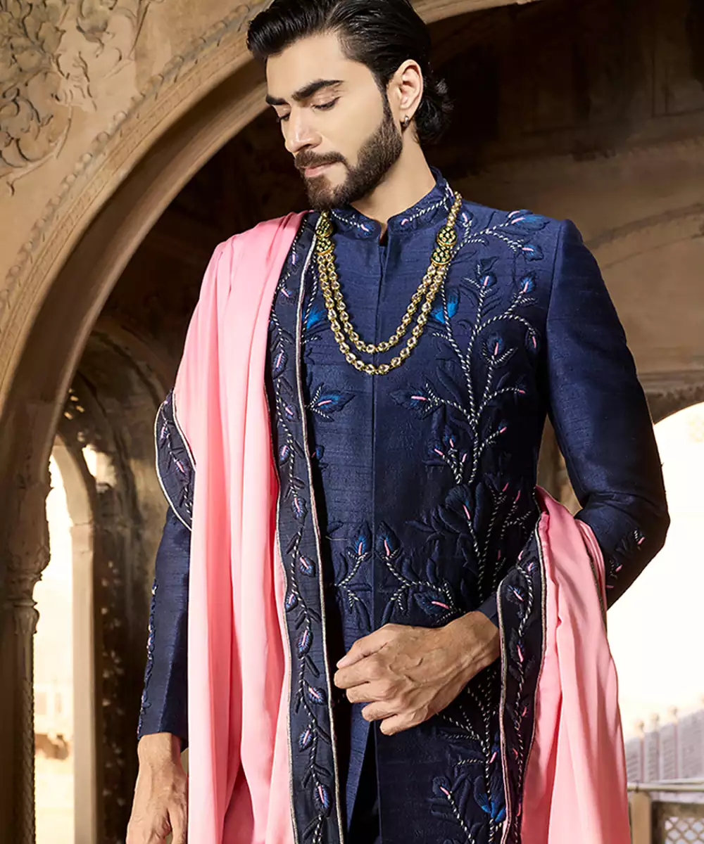 This Blue Raw Silk Sherwani Features Detailed Embroidery That Enhances Its Structured Silhouette. The Lustrous Fabric And Elegant Motifs Create A Sophisticated Festive Look, Perfect For Traditional Celebrations And Wedding Functions Where Refined Craftsmanship And Bold Color Meet Classic Indian Styling.