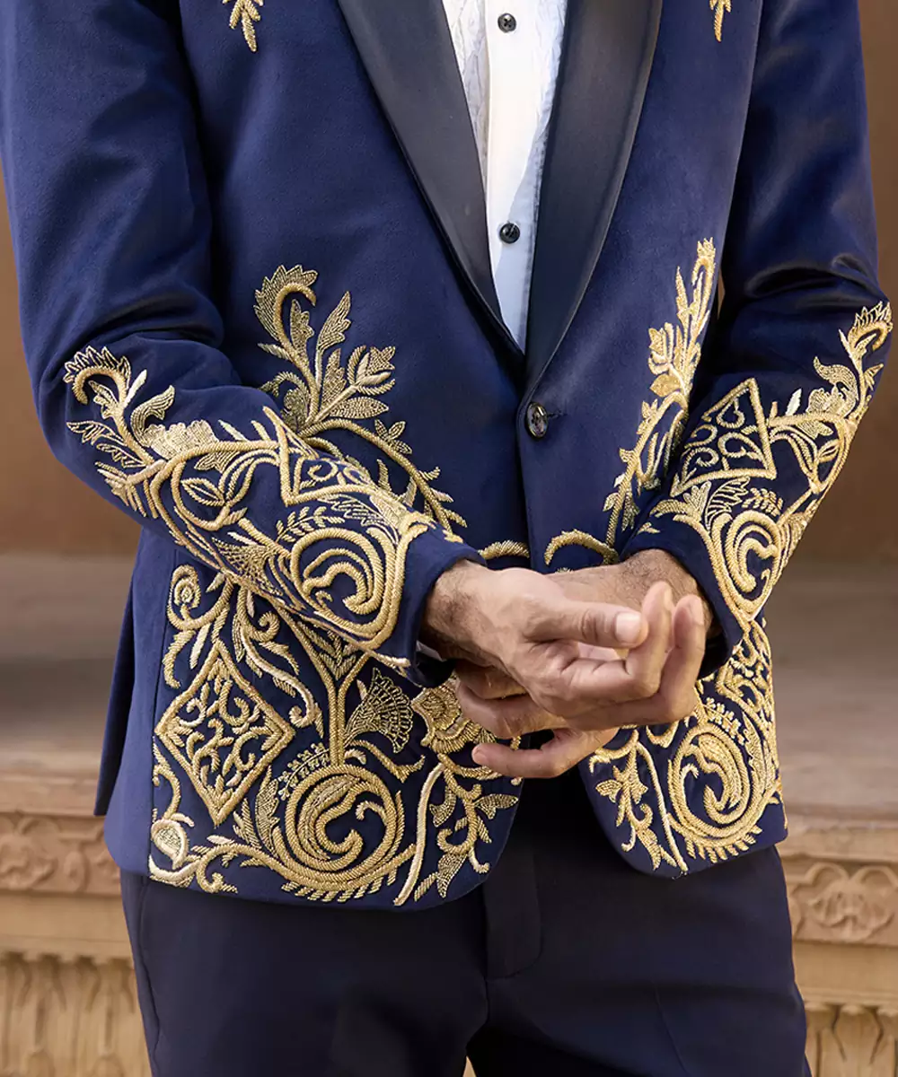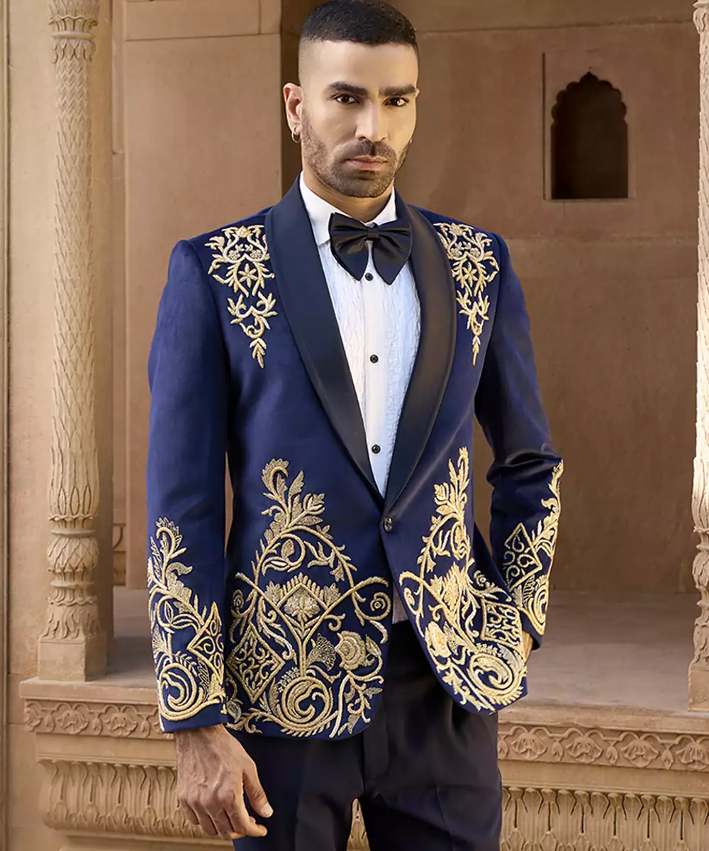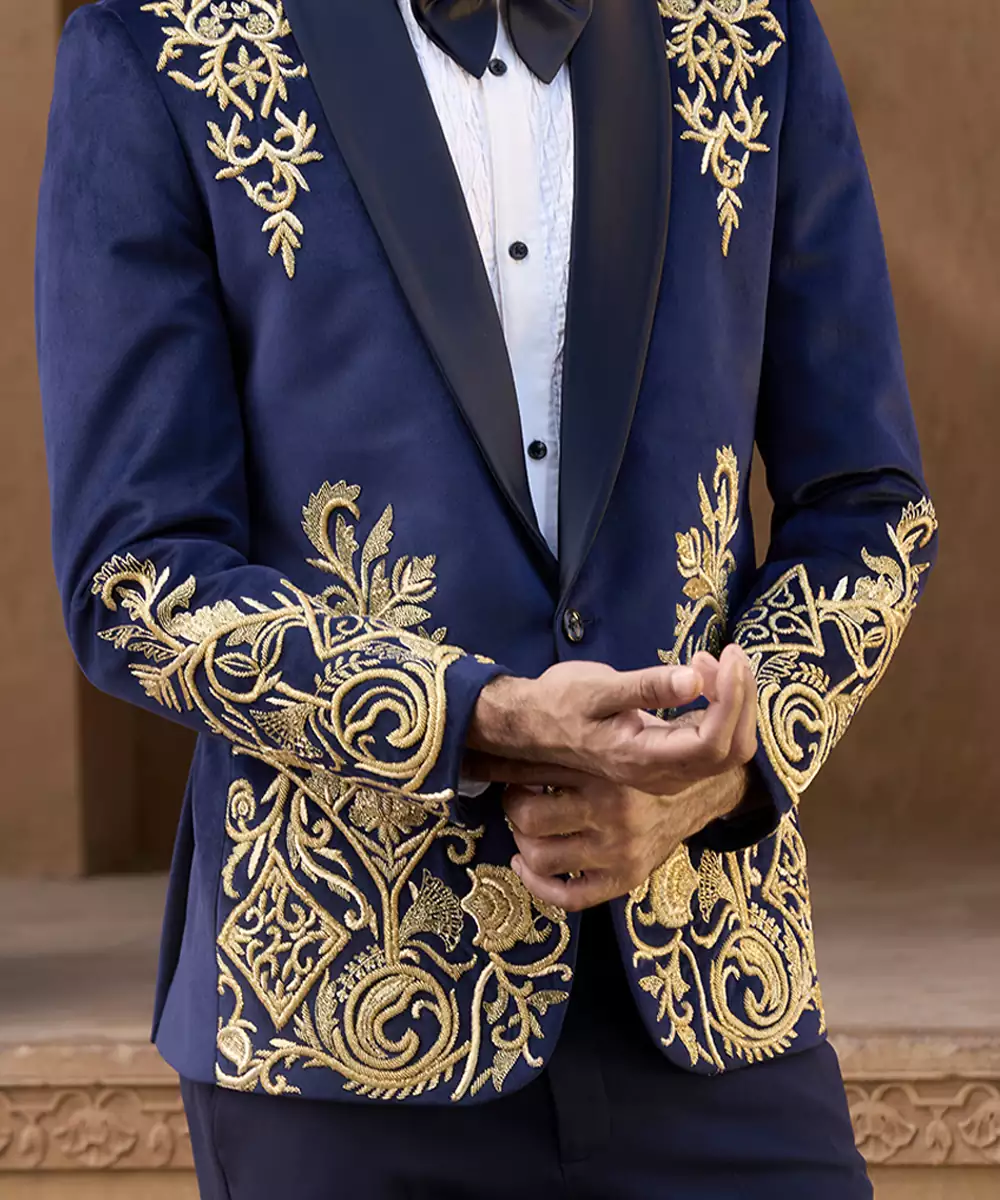 A Blue Velvet Tuxedo Accented With Intricate Embroidery For A Refined Festive Presence. The Rich Fabric And Tailored Silhouette Create A Striking Formal Ensemble, Perfect For Receptions And Celebratory Evenings With A Bold Yet Elegant Character.