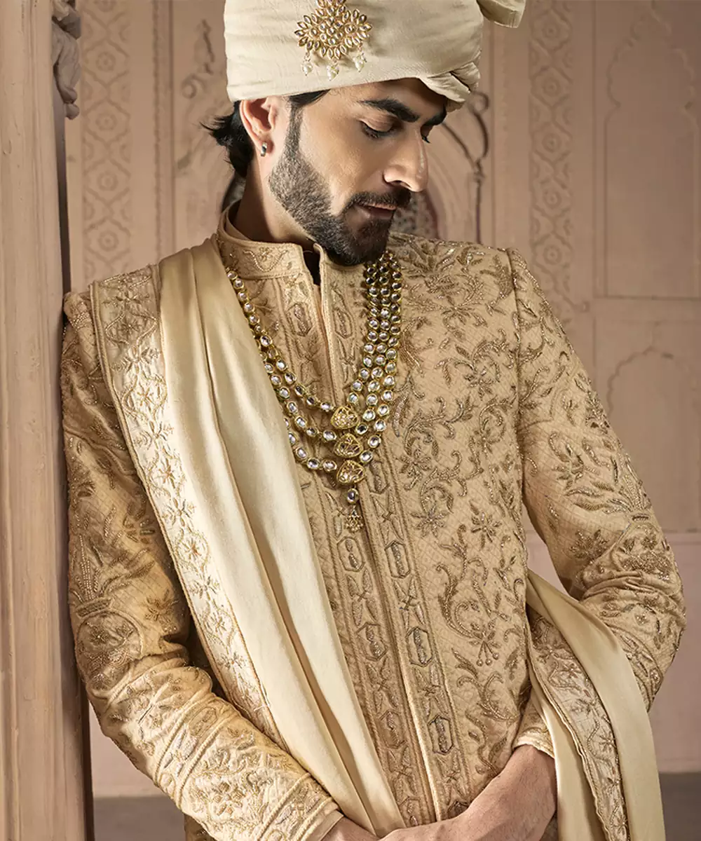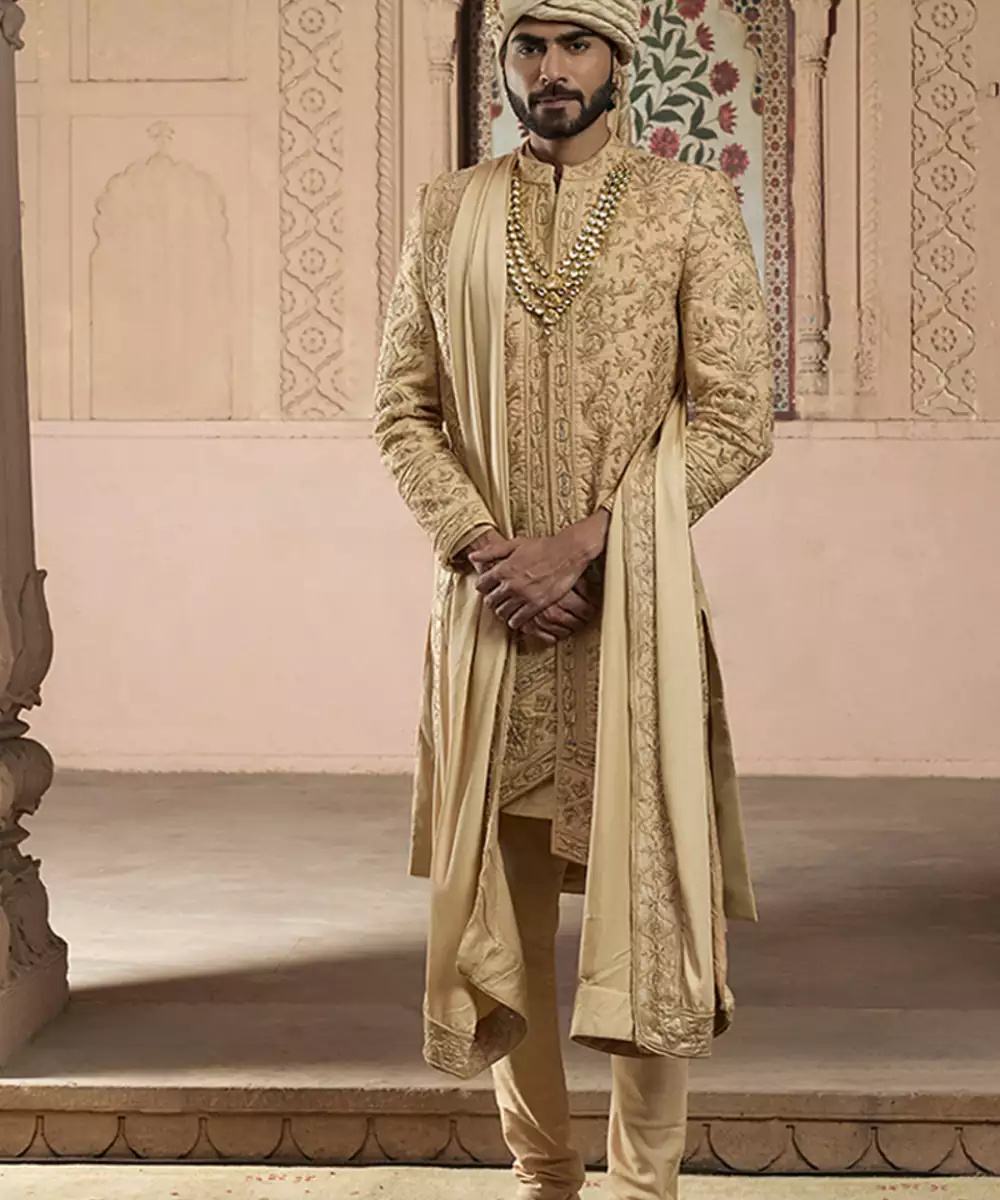 Designed In Opulent Raw Silk, This Gold Sherwani Showcases Intricate Embroidery That Enhances Its Majestic Appeal. The Rich Fabric Structure And Warm Metallic Tone Create A Statement Ensemble, Perfect For Wedding Ceremonies And Grand Festive Events Requiring Traditional Elegance.