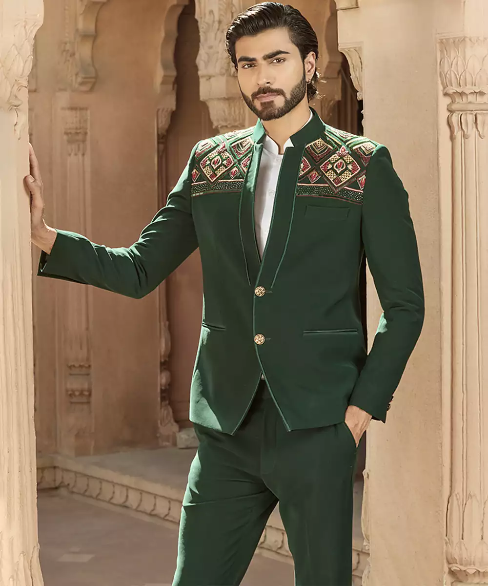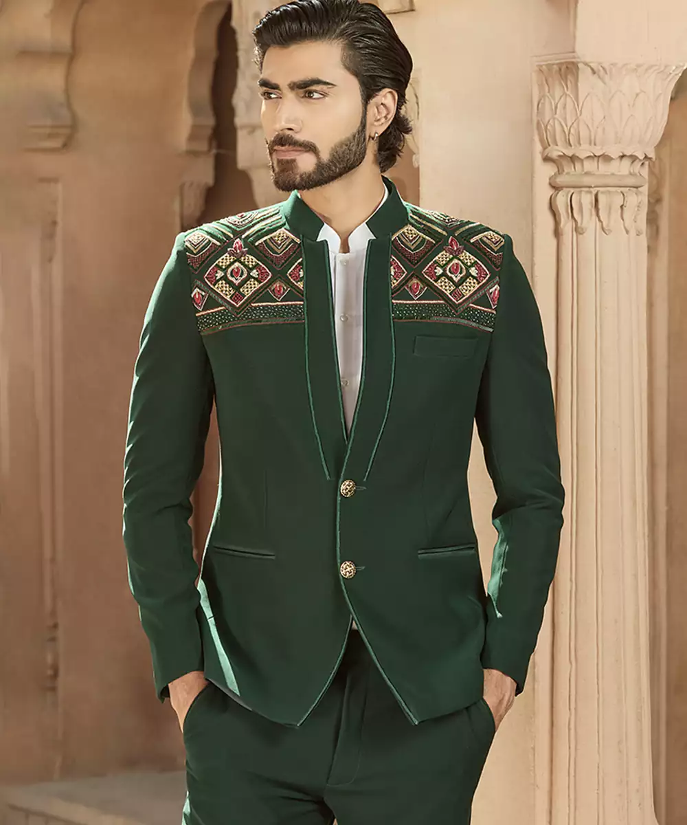 This Green Linen Bandhgala Set Features Fine Embroidery That Enhances Its Fresh Festive Appeal. The Breathable Texture And Structured Tailoring Offer A Polished Look, Perfect For Daytime Weddings And Celebratory Occasions.