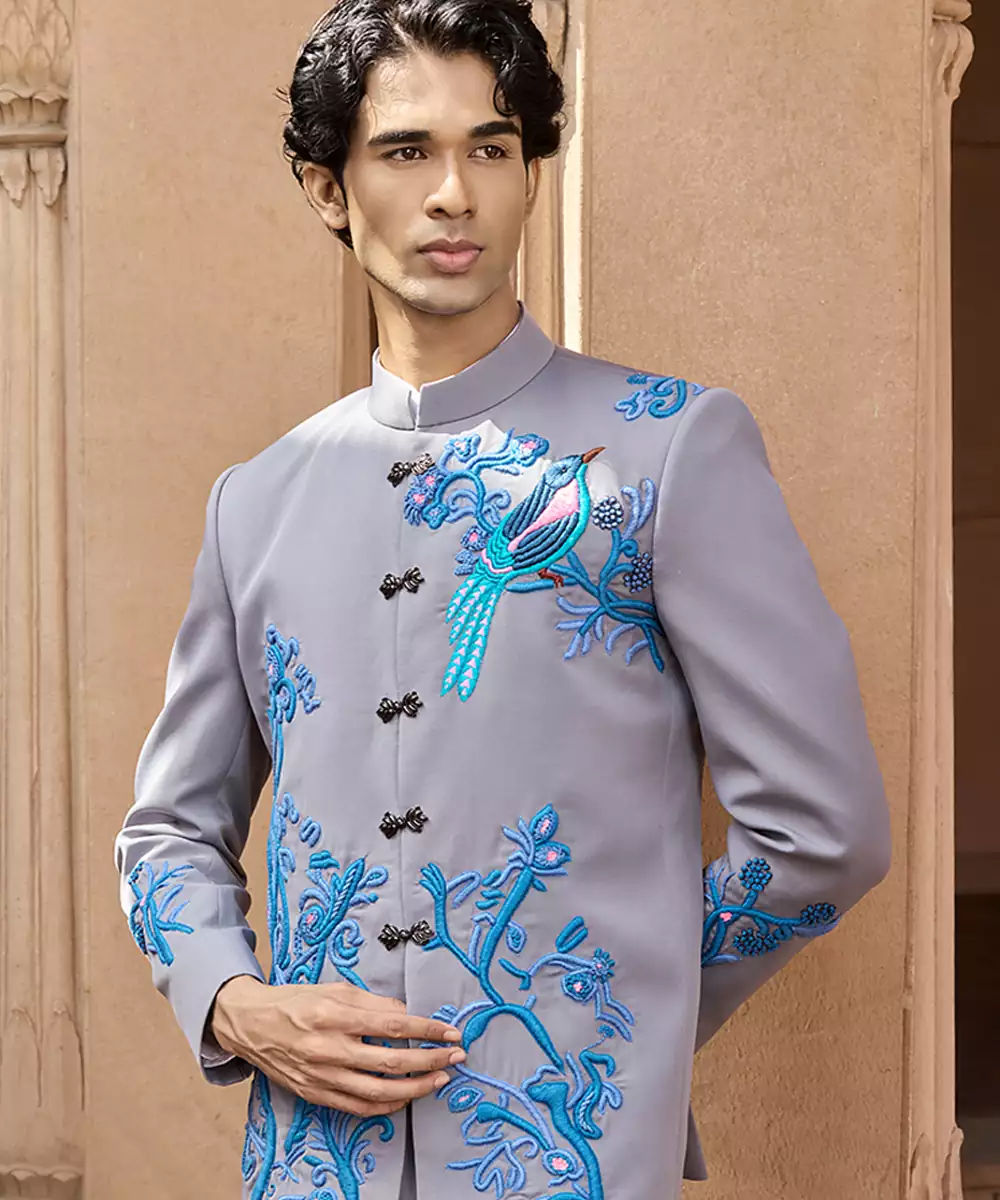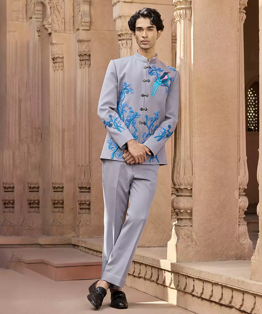 A Grey Linen Bandhgala Set Enriched With Refined Embroidery For A Subtle Festive Charm. The Neutral Tone And Tailored Silhouette Create A Modern Ethnic Look, Ideal For Formal Celebrations And Wedding Events.