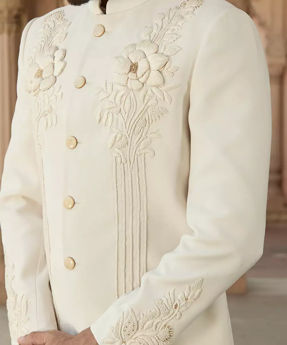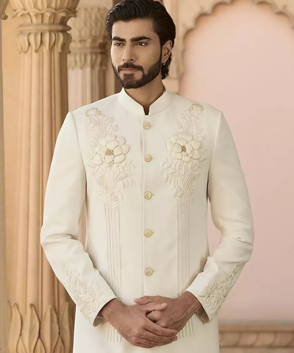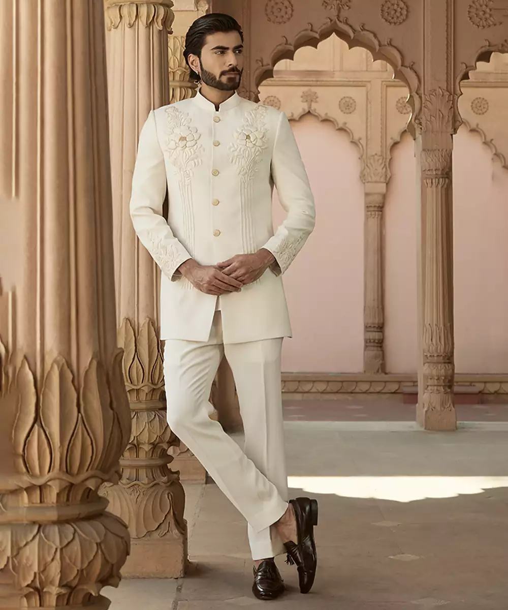 This Ivory Bandhgala Set Is Crafted From Smooth Crepe Silk And Accented With Elegant Embroidery For A Modern Festive Appeal. The Soft Drape And Refined Structure Create A Contemporary Silhouette, Making It Ideal For Receptions And Formal Celebrations With Traditional Undertones.