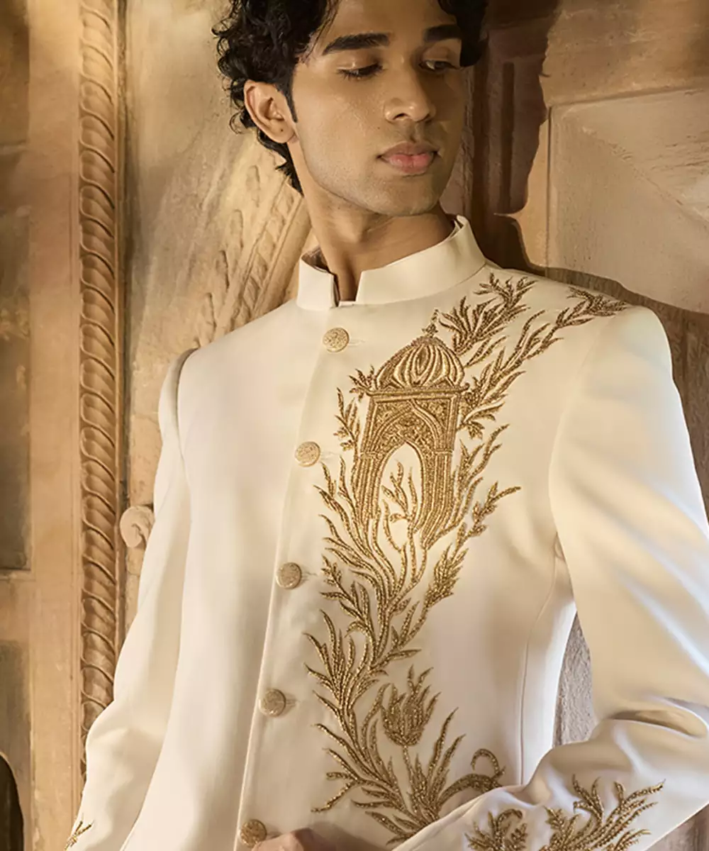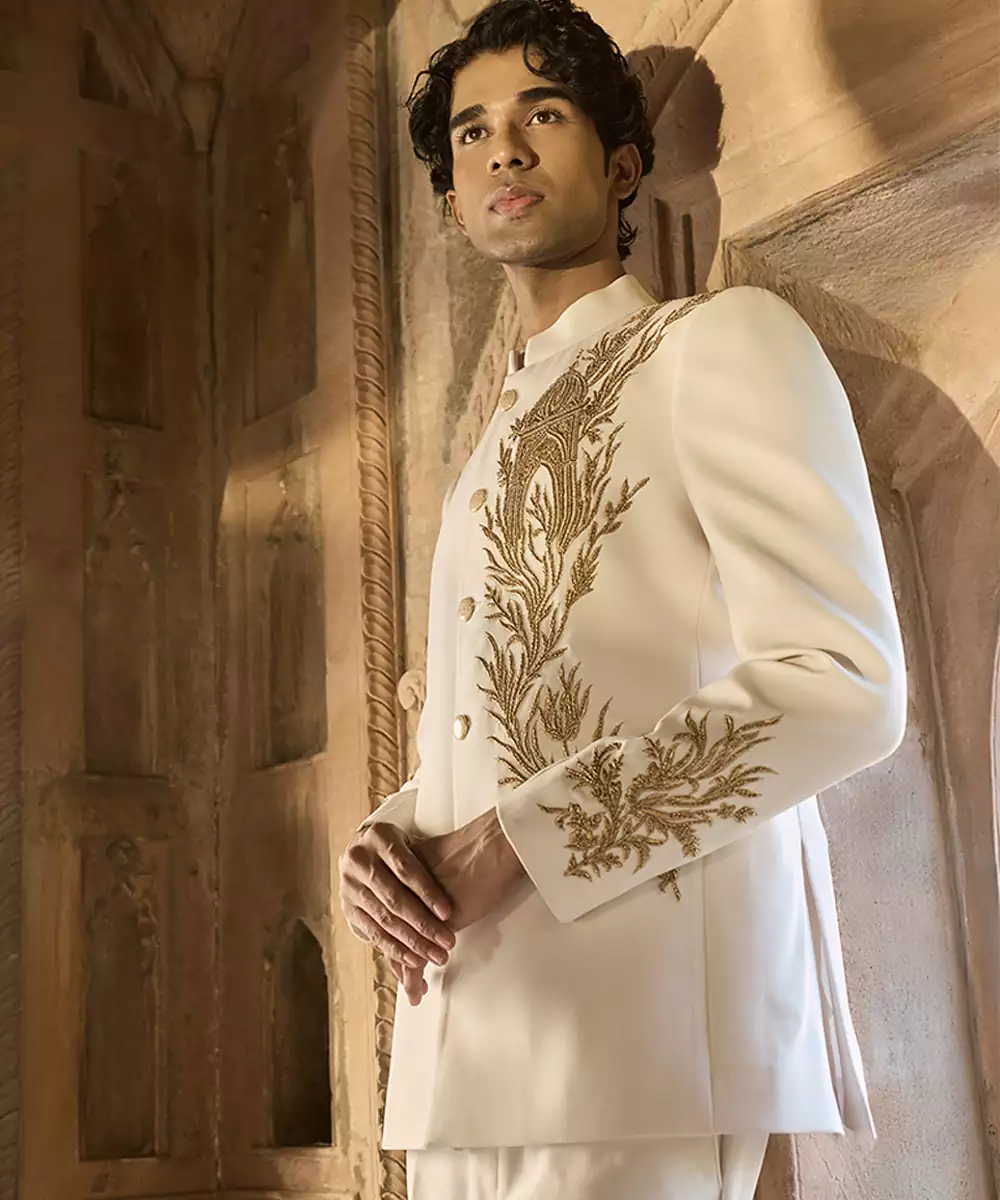 An Ivory Linen Bandhgala Set Adorned With Delicate Embroidery For A Graceful Festive Finish. The Light Texture And Tailored Fit Create An Elegant Silhouette, Making It Suitable For Weddings And Refined Cultural Celebrations.