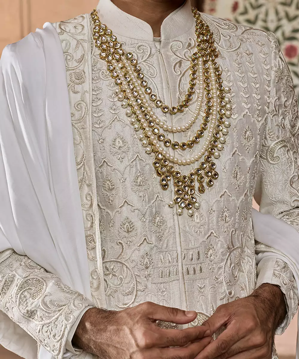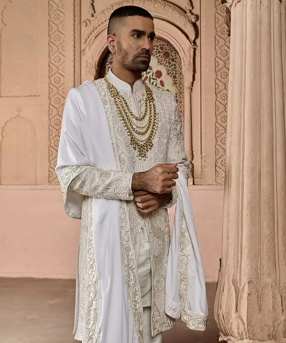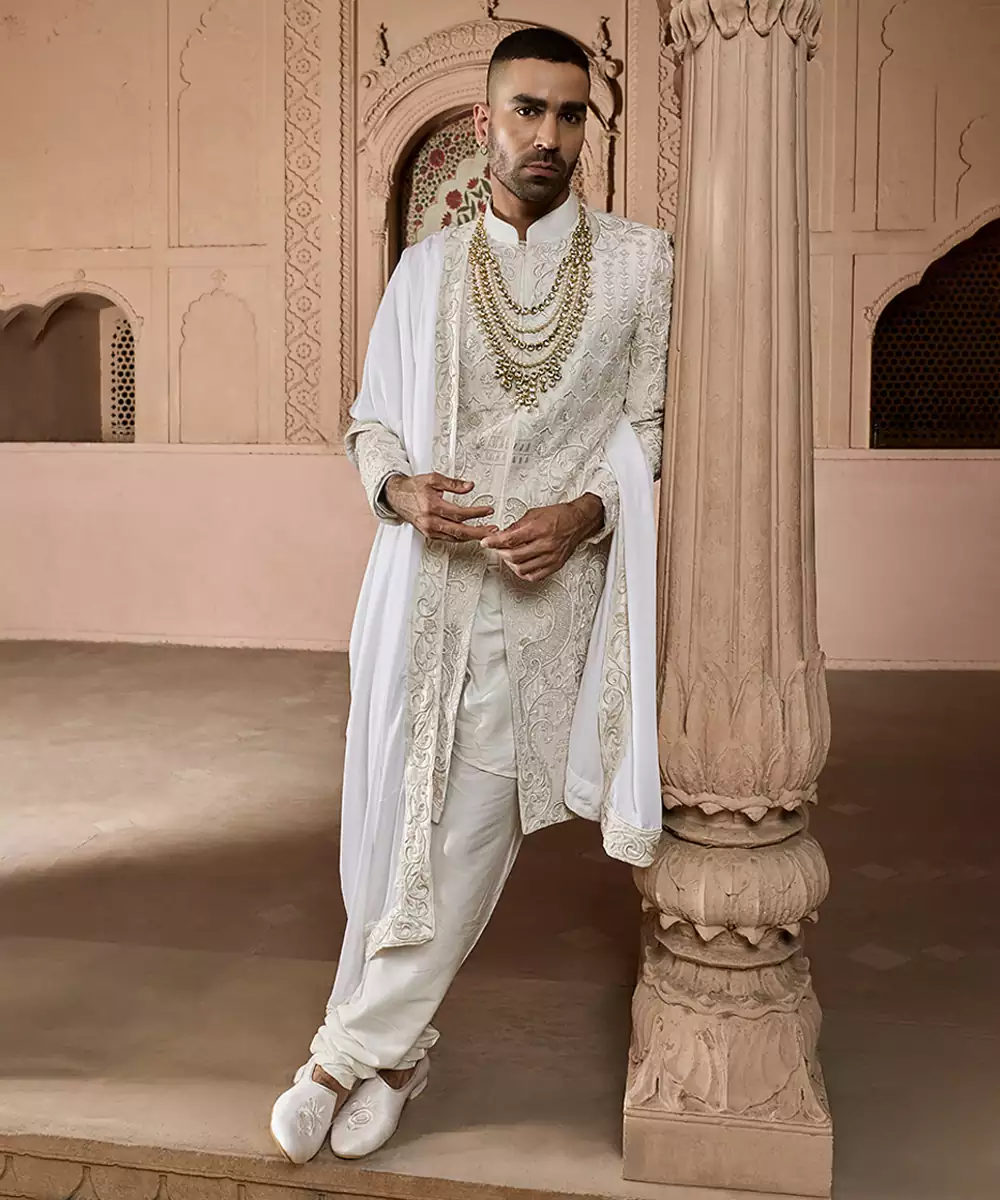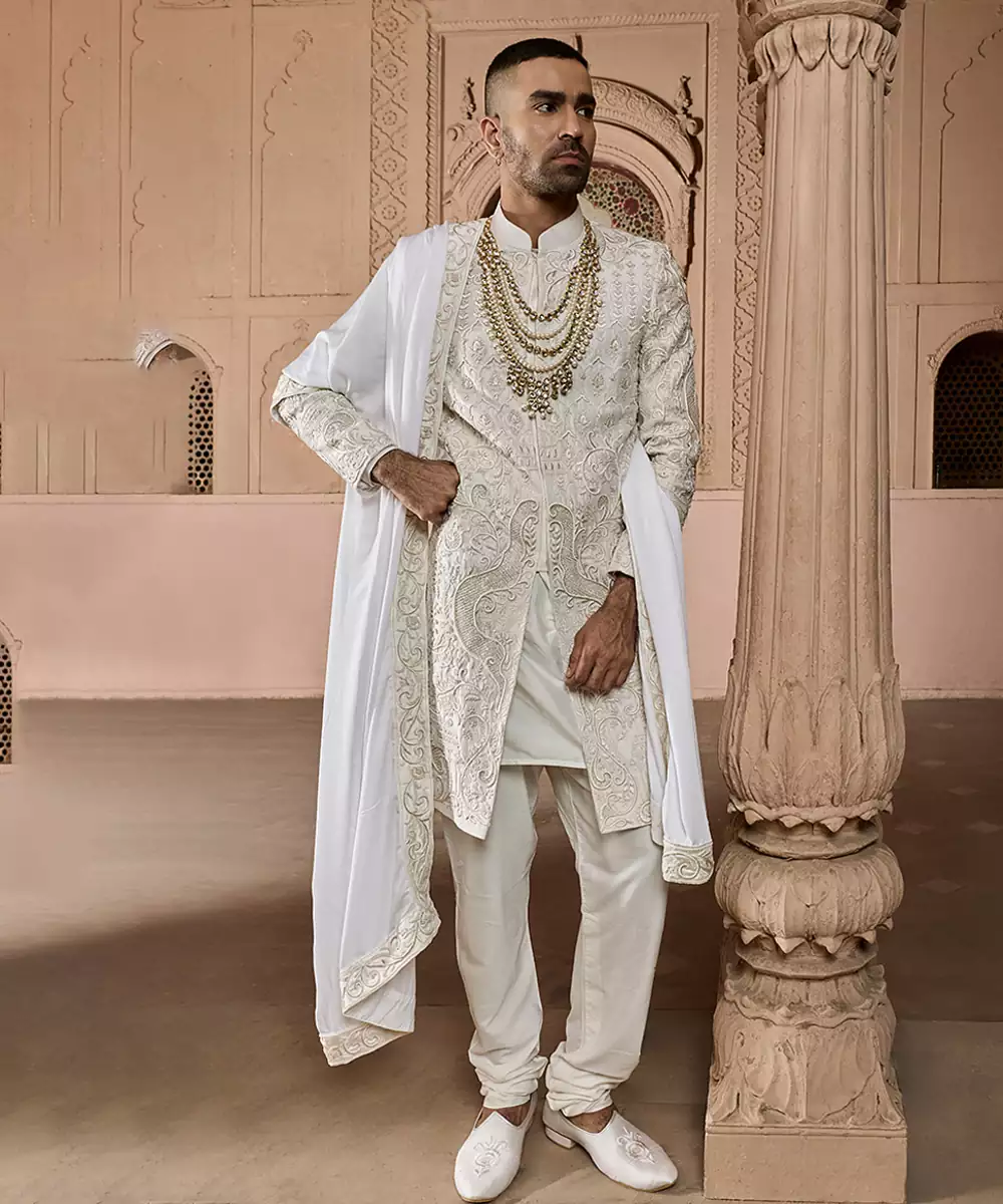 An Ivory Raw Silk Sherwani Embellished With Refined Embroidery, Offering A Graceful Balance Of Subtle Luxury And Traditional Charm. The Textured Weave And Tailored Silhouette Provide A Polished Appearance, Suitable For Weddings And Cultural Festivities With Understated Sophistication.
