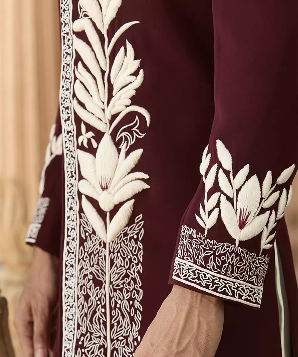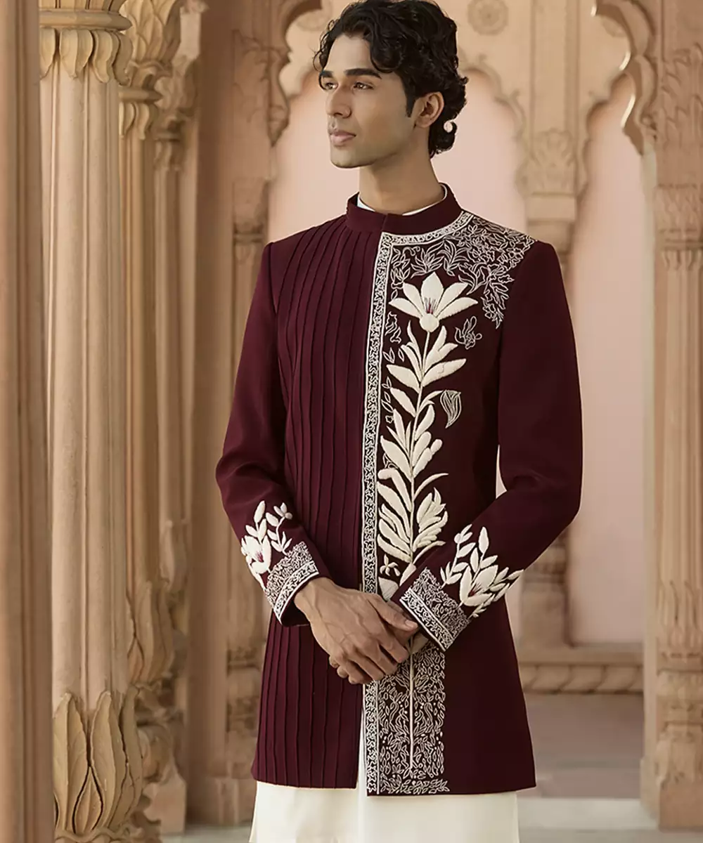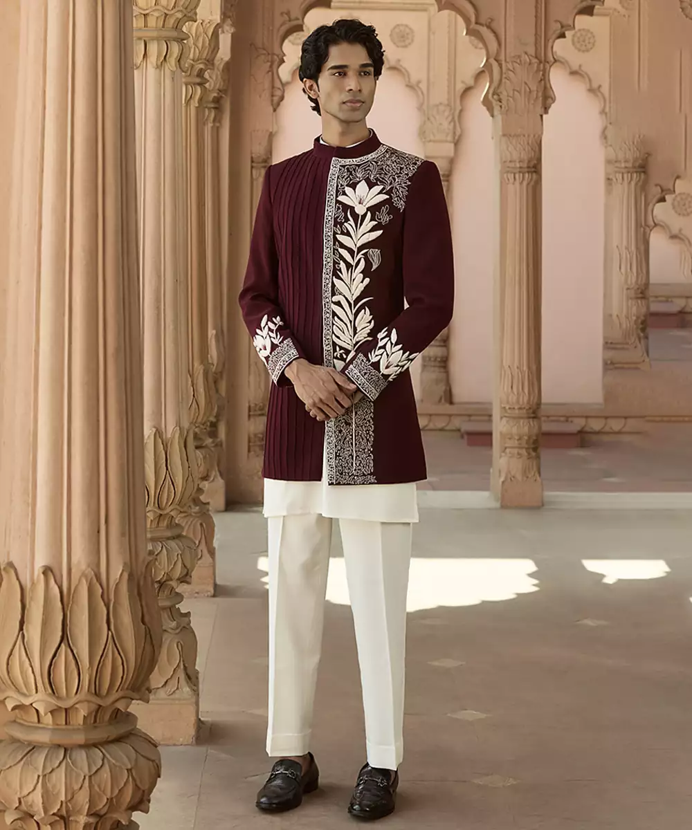 A Maroon Linen Bandhgala Set Featuring Detailed Embroidery For A Sophisticated Festive Look. The Breathable Fabric And Tailored Design Ensure Comfort And Elegance, Making It Suitable For Weddings And Cultural Occasions Where Classic Style Meets Modern Refinement.