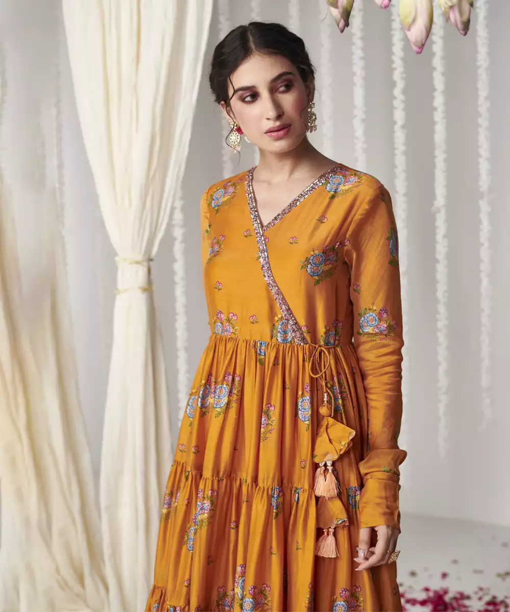 Orange Printed Angrakha Anarkali In Cotton Silk Fabric With Embroidered Neckline And Cotton Silk Printed Dupatta With Mulmul Lining Colour: Orange Fabric: Cotton Silk Components : 1 Anarkali / 1 Dupatta