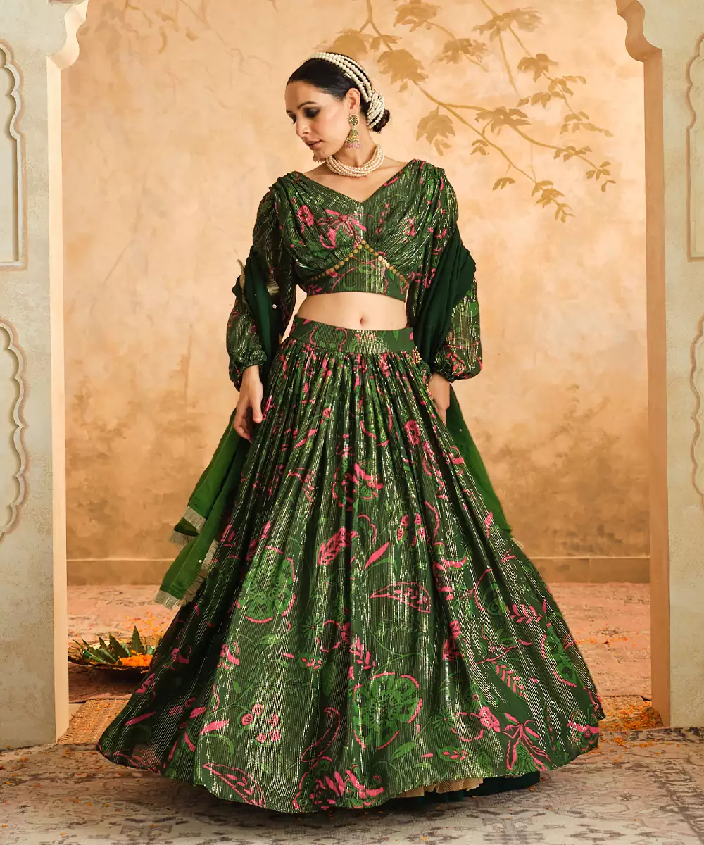 Elevate Your Style With Our Green Cocktail Lehenga Set, A Fusion Of Traditional Charm And Modern Sophistication. Crafted From Shimmering Lurex, The Lehenga Skirt And Blouse Feature A Timeless Floral Chintz Print.The Set Is Completed With A Solid Organza Dupatta, Embellished With Delicate Embroidery For Added Grace. This Lehenga Set Ensures You Stand Out With Effortless Elegance And Refined Beauty.