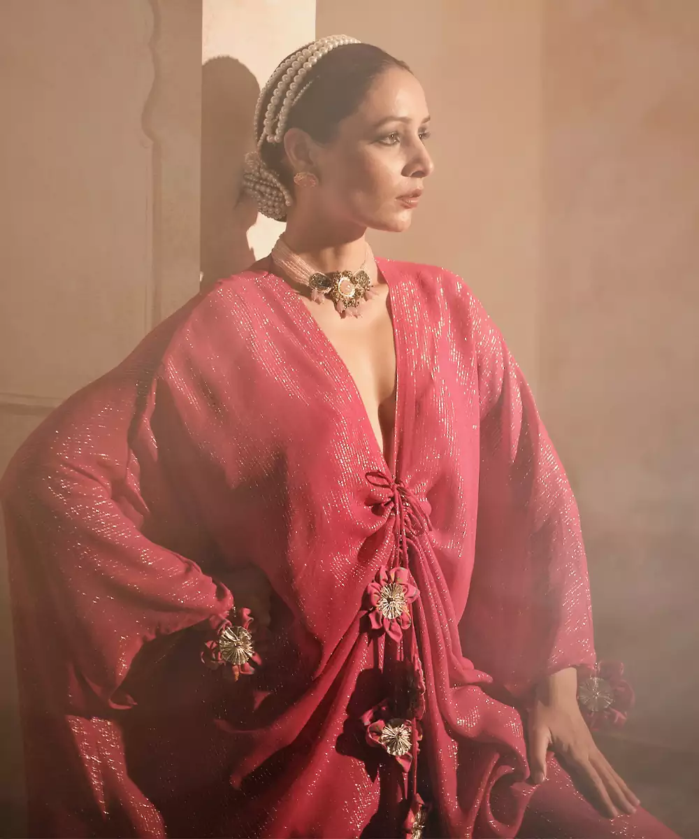 The Bohemian Kaftaan In Lurex Georgette Offers A Relaxed And Stylish Option For Those Who Appreciate Effortless Elegance. Crafted From Luxurious Lurex Georgette, This Kaftaan Combines Comfort With A Bohemian Flair, Featuring A Loose, Flowing Silhouette That Drapes Beautifully.