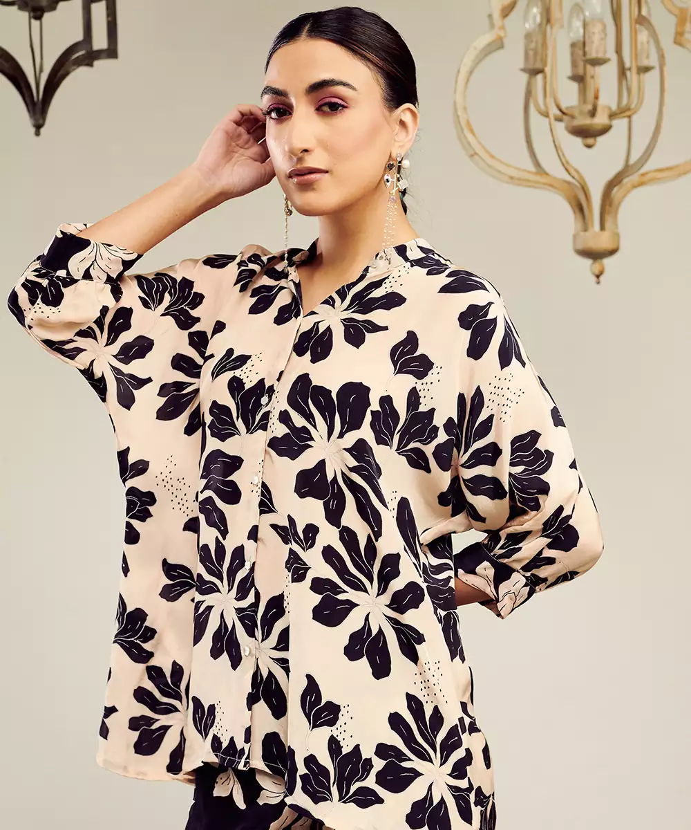 Black & White Leaf Print Digital Printed Co Ord Set In Crepe Colour: Black Fabric: Crepe Components : 1 Top / 1 Pant