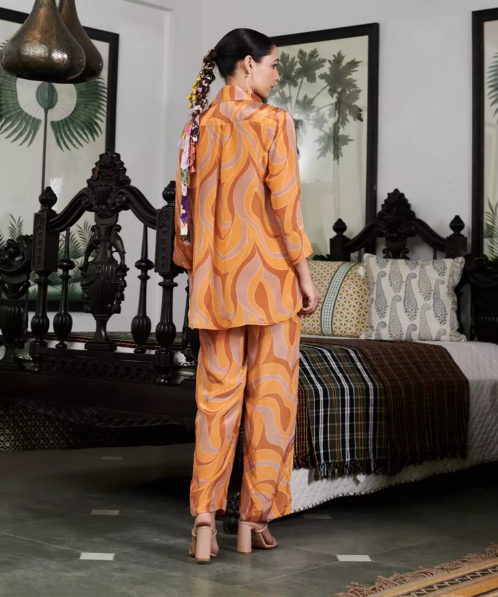 Peach Orange Abstract Digital Printed Co Ord Set In Crepe Colour: Peach Fabric: Crepe Components : 1 Top / 1 Pant