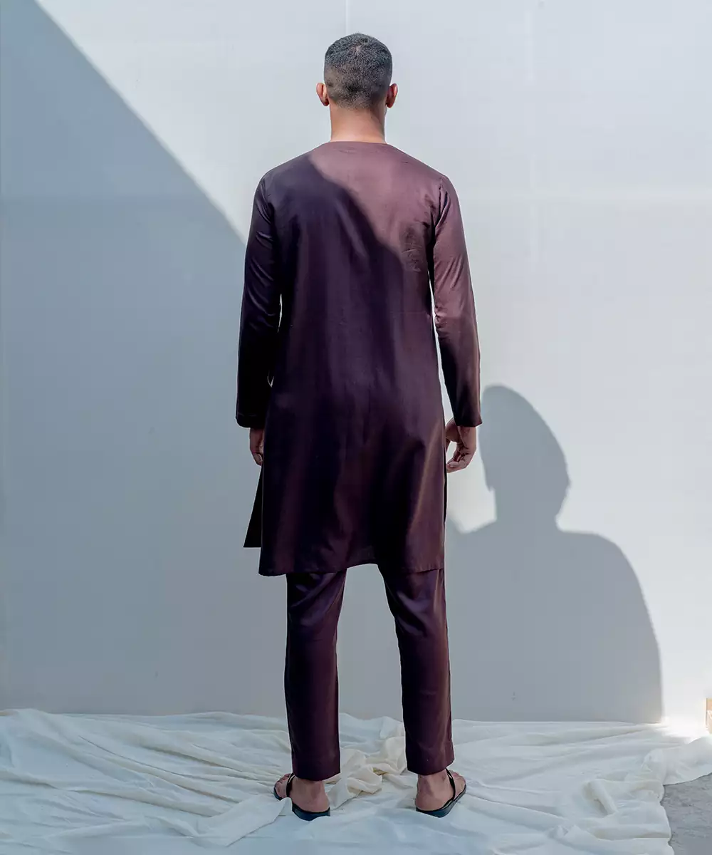 Asymmetric Long Embroidered Achkan With Asymmetric Kurta And Straight Pants.
