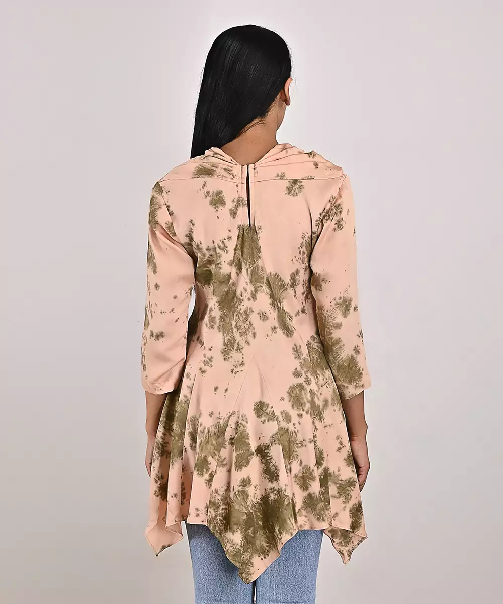 Our Classic Frill Top In Tie & Dye With An Attractive Cowl. It Has A Free Flowing Drape. This Fit Is To Be Worn For Brunch Or An Evening Do.
