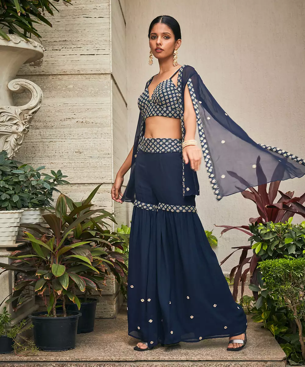 Flaunt The Charisma With Our Iha Navy Blue Sharara Set. Look Your Absolute Best In This Embroidered Set. .