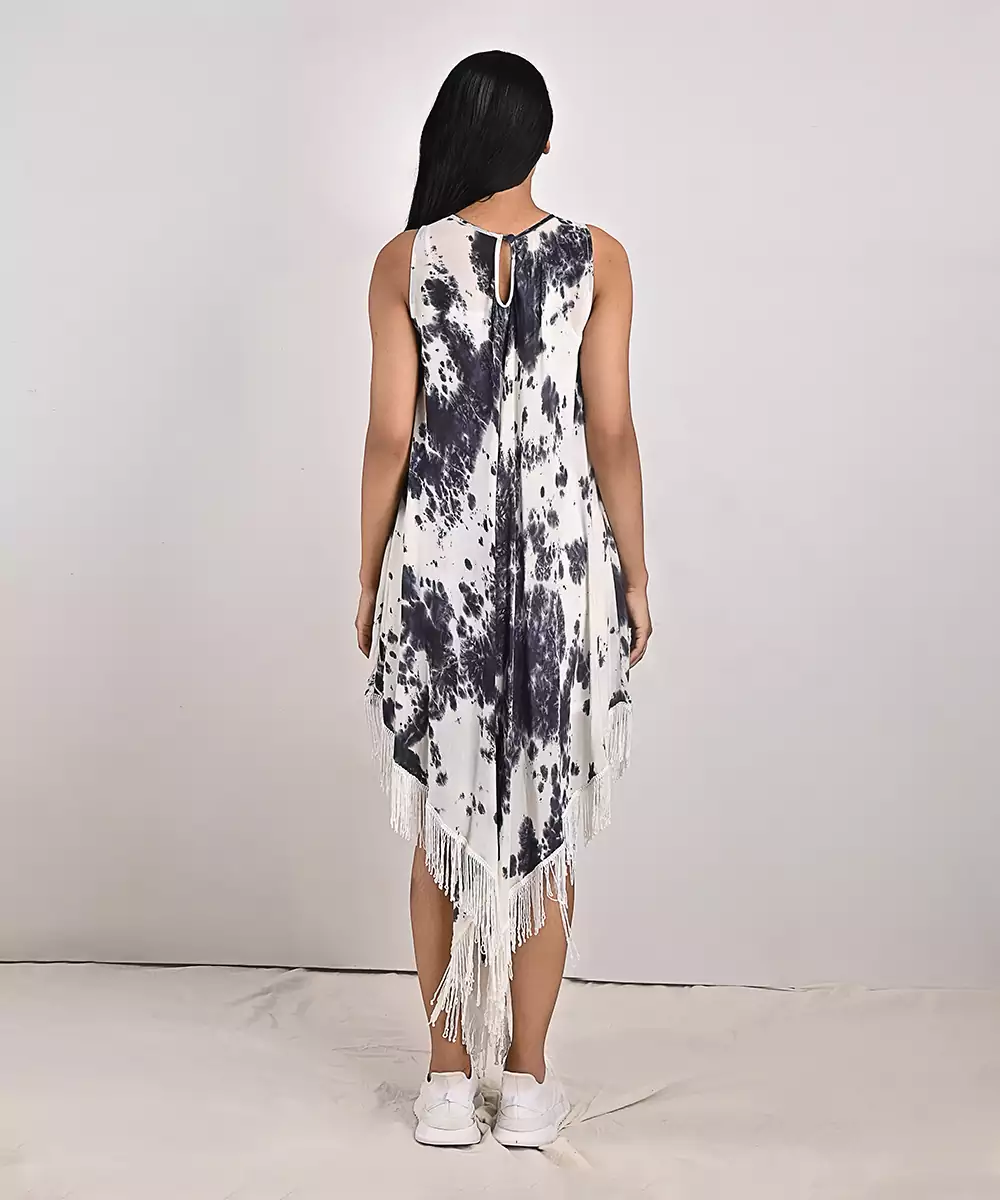 This Tie & Dye Dress Is Modish And Suave. It Comes With Fringes Across The Hemline And Has An Asymmetrical Free Flowing Hemline.