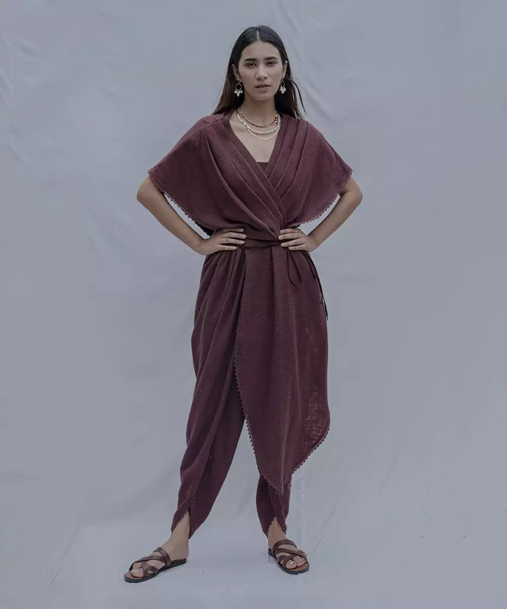 This Dhoti Style Is A Straight Fit Jumpsuit In Earthy Brown Color. Crafted Beautifully In Pleats, And Constructed In A Summer Friendly Fabric With Natural Drapes.