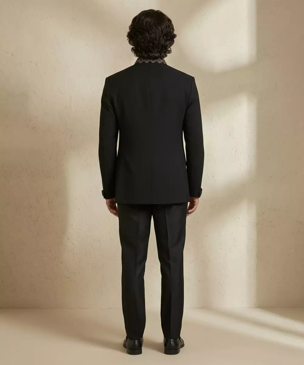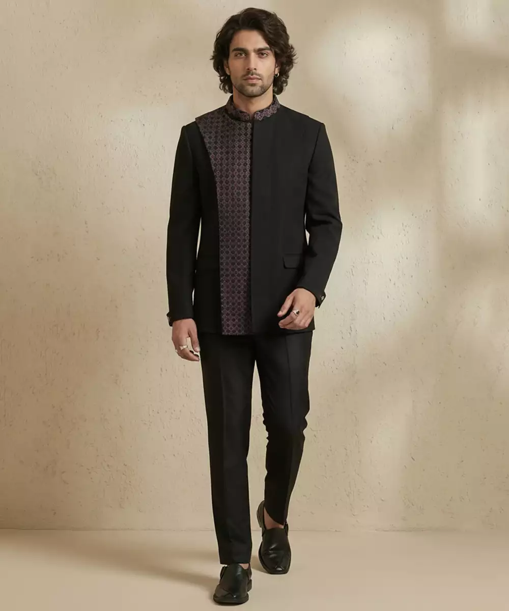 Black Crepe Bandhgala Set Featuring A Sleek Tailored Silhouette With A Mandarin Collar And Concealed Placket. Crafted In Fluid Crepe For A Smooth Drape, It Offers Understated Elegance. Perfect For Evening Receptions, Cocktail Functions, And Modern Festive Wear, Styled With Minimal Accessories And Classic Footwear. For Ultimate Festive Appeal Today.