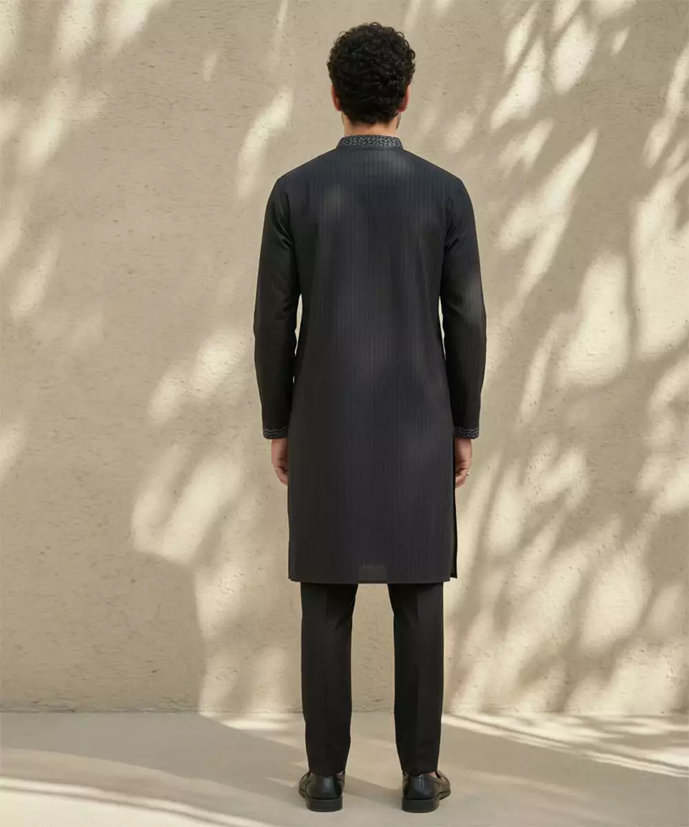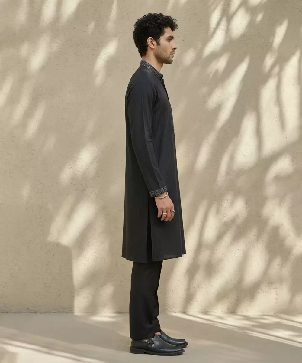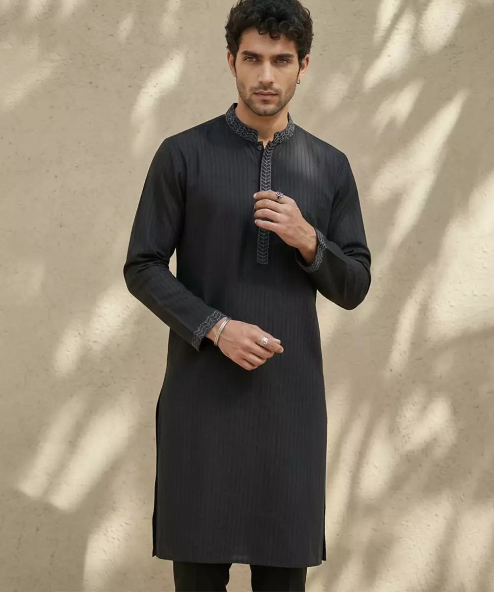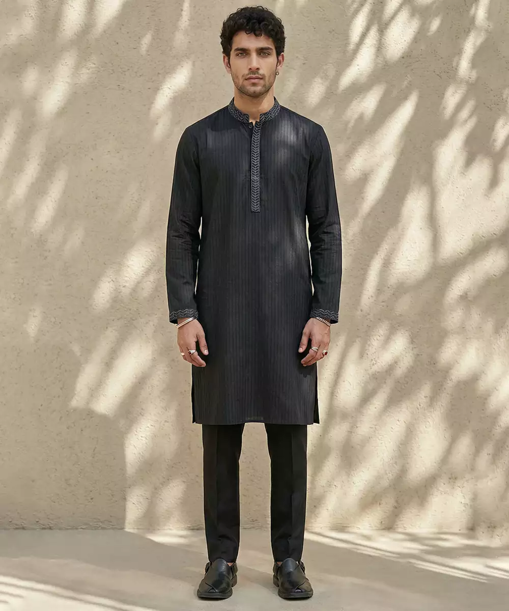 This Black Embroidered Cotton Silk Kurta Set Exudes Timeless Elegance And Refined Craftsmanship. Made From A Luxurious Cotton Silk Blend, The Kurta Features Intricate Embroidery That Adds A Sophisticated Touch. Perfect For Weddings, Festive Occasions, Or Formal Gatherings, It Pairs Effortlessly With Matching Bottoms For A Polished And Stylish Ensemble.