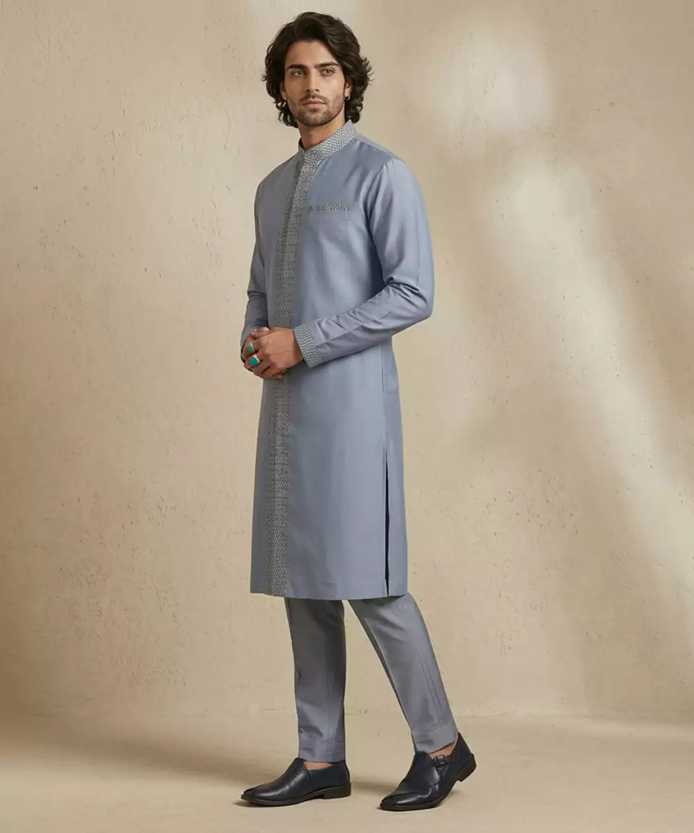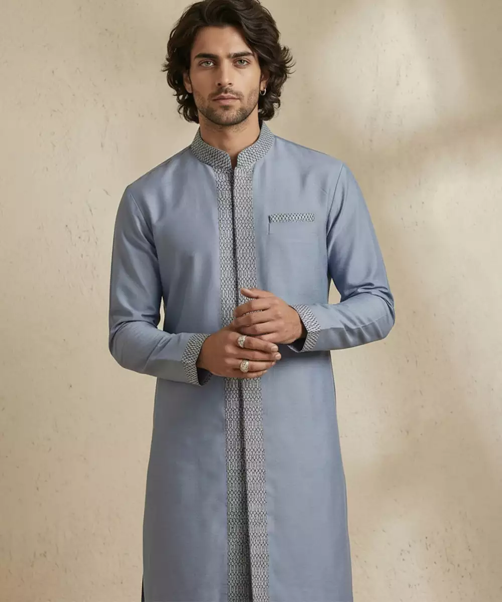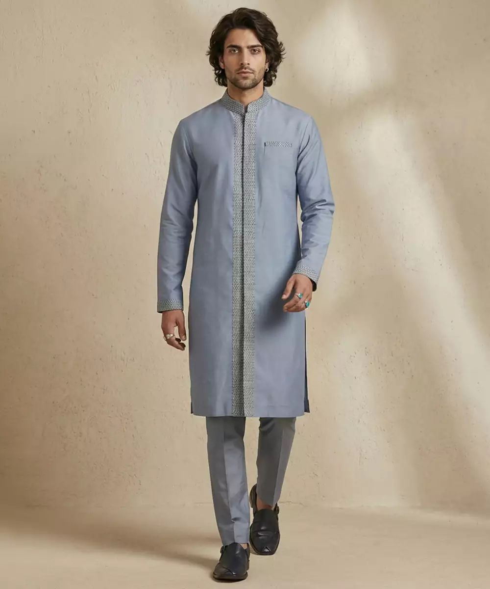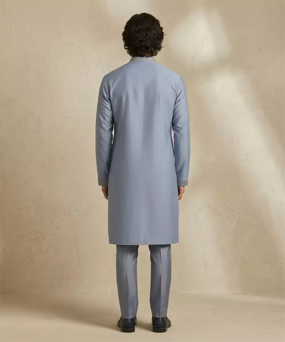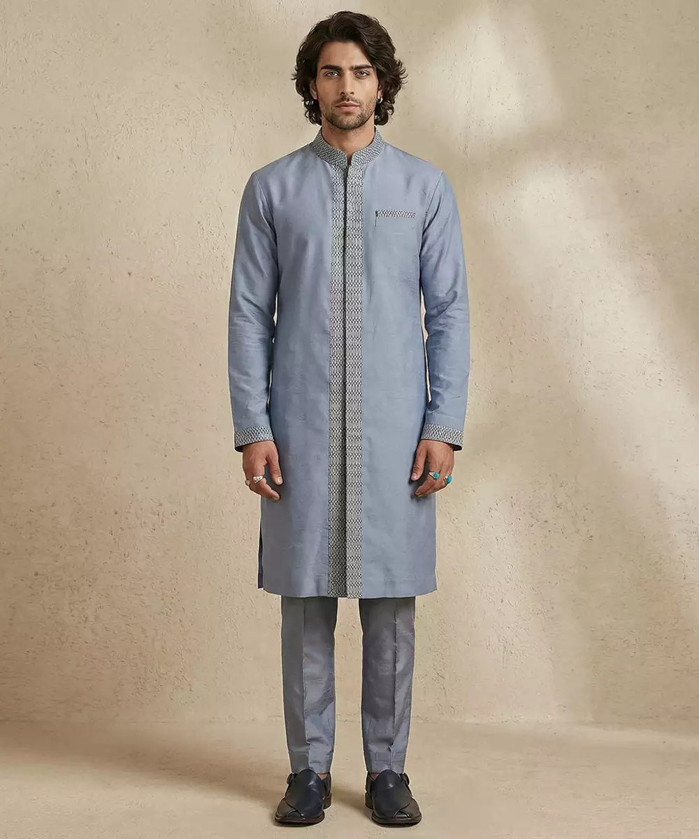 This Blue Embroidered Cotton Silk Kurta Set Combines Elegance With Comfort, Crafted From A Soft Cotton Silk Blend For A Luxurious Feel. Featuring Intricate Embroidery, It Adds A Touch Of Sophistication To Any Occasion. Perfect For Festive Gatherings, Weddings, Or Formal Events, It Pairs Beautifully With Matching Bottoms For A Complete Look.