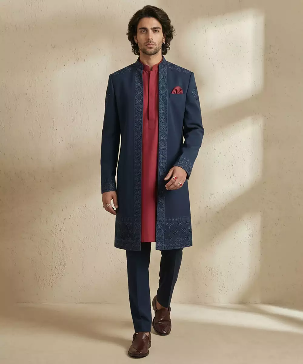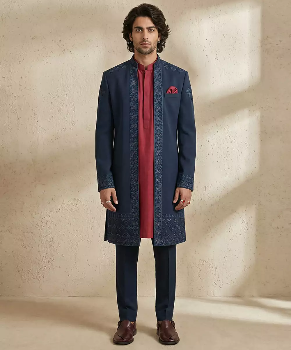 This Blue Embroidered Crepe Sherwani Exudes Elegance And Sophistication, Perfect For Weddings And Festive Occasions. Crafted From Premium Crepe, The Sherwani Features Intricate Embroidery That Adds A Regal Touch.