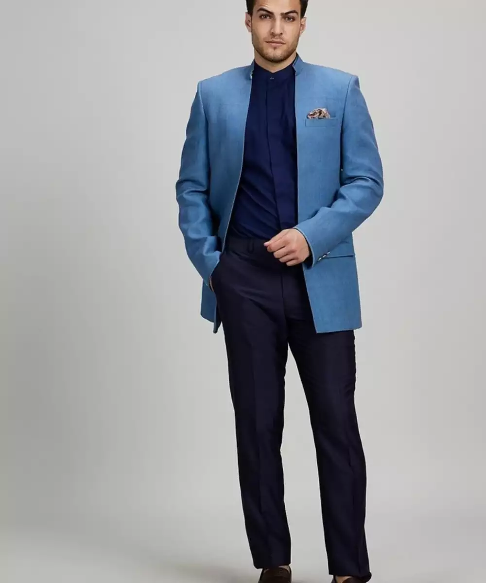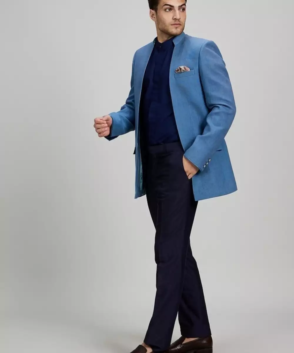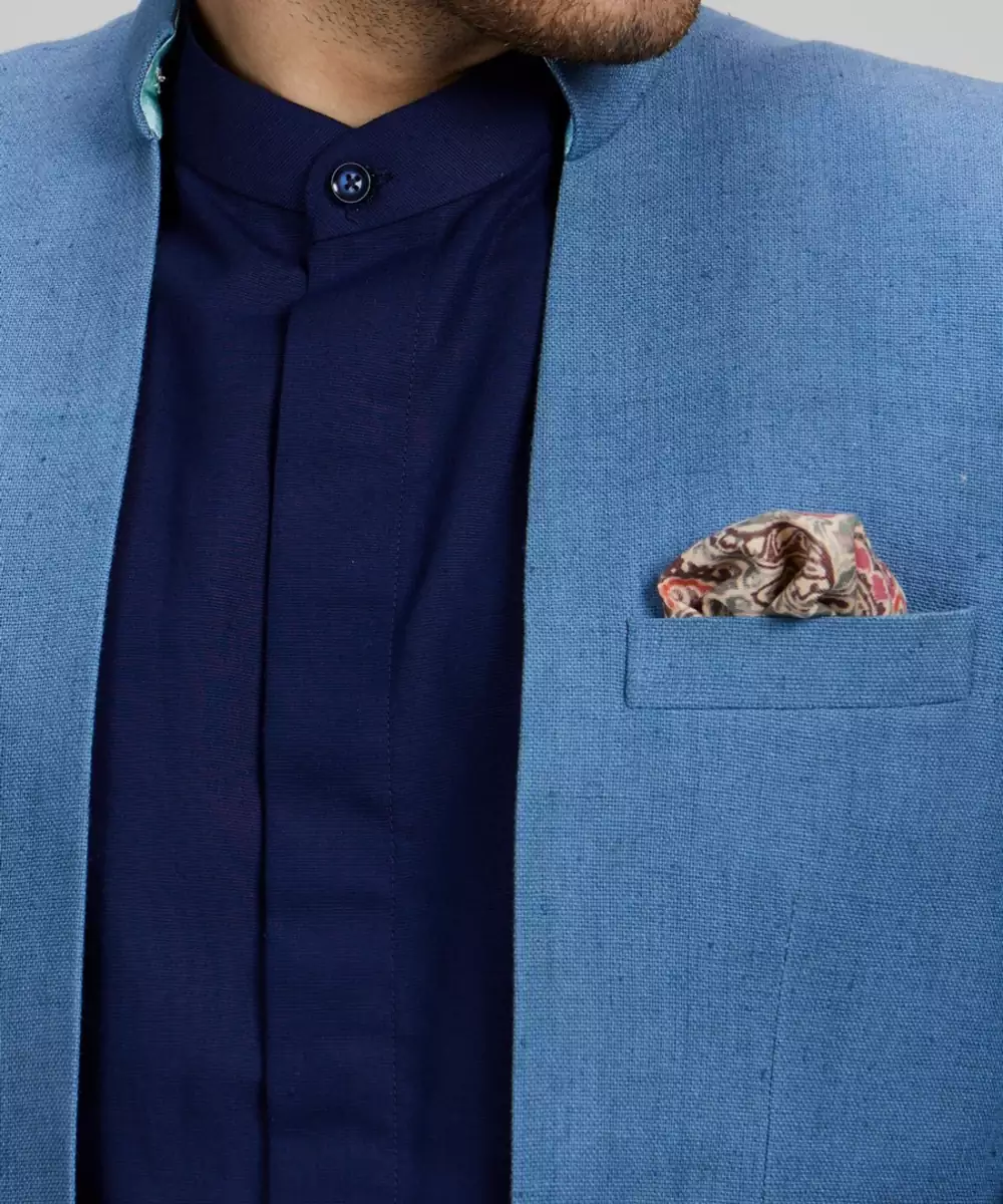Elevate Your Style With This Blue Matka Silk Woven Bandhgala Jacket. Crafted From Textured Matka Silk, It Offers A Refined Yet Rustic Charm. The Structured Silhouette And Traditional High Neck Design Make It Perfect For Weddings, Festive Events, Or Formal Gatherings. A Sophisticated Blend Of Heritage And Modern Elegance.