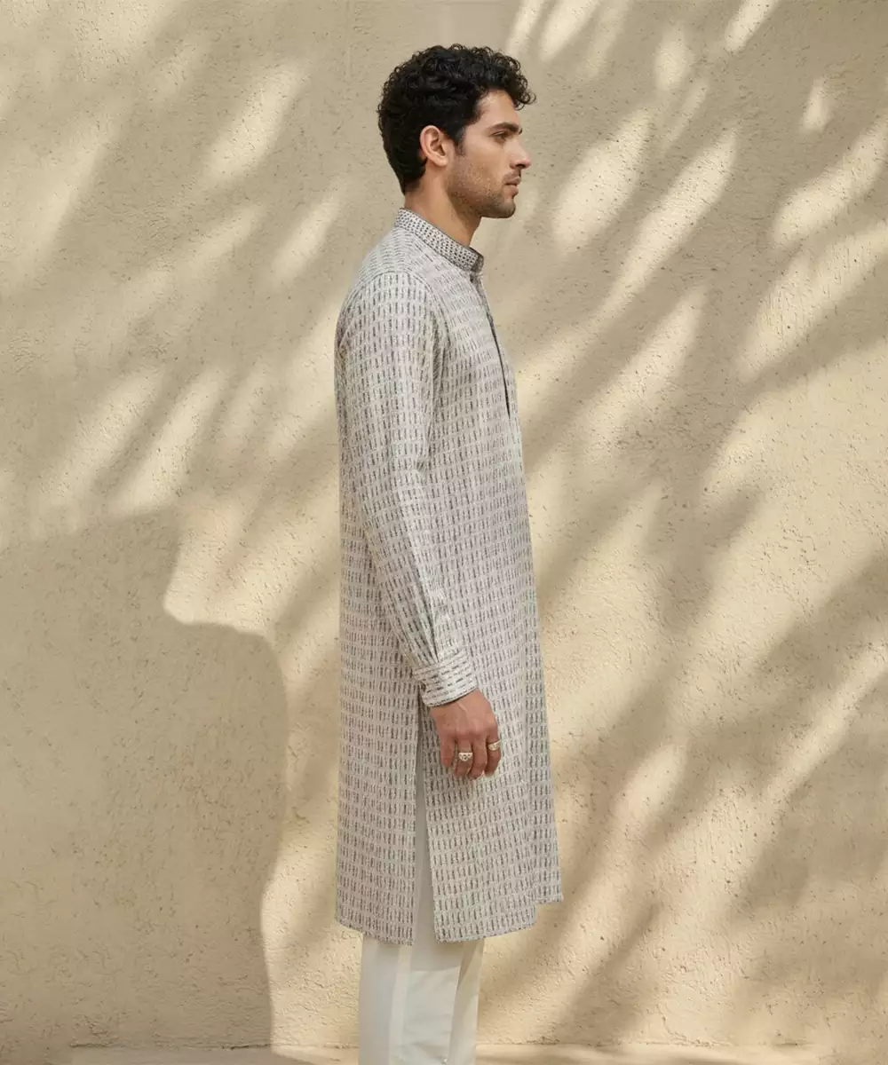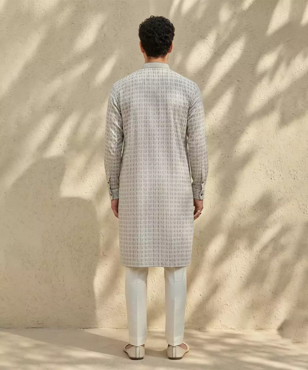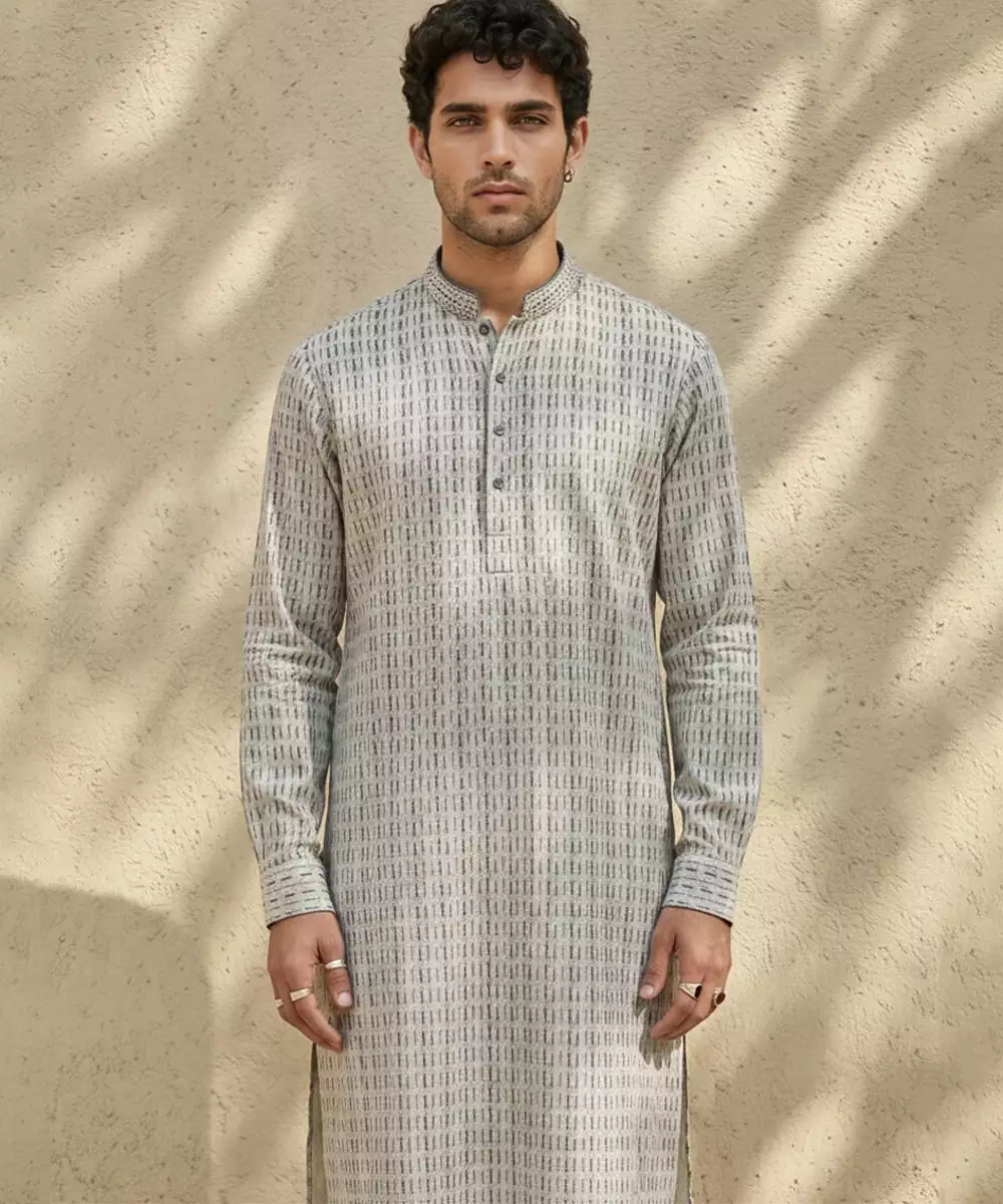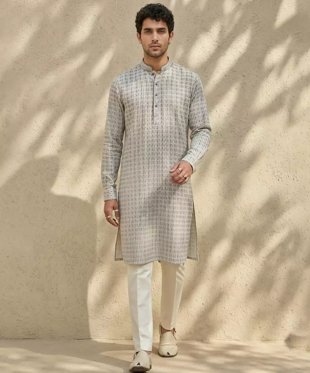 This Grey Woven Cotton Kurta Set Combines Understated Elegance With Everyday Comfort. Crafted From Soft, Breathable Cotton, The Kurta Features A Subtle Woven Texture That Adds A Refined Touch. Perfect For Festive Occasions, Formal Gatherings, Or Casual Celebrations, It Pairs Effortlessly With Matching Bottoms For A Polished And Versatile Look.