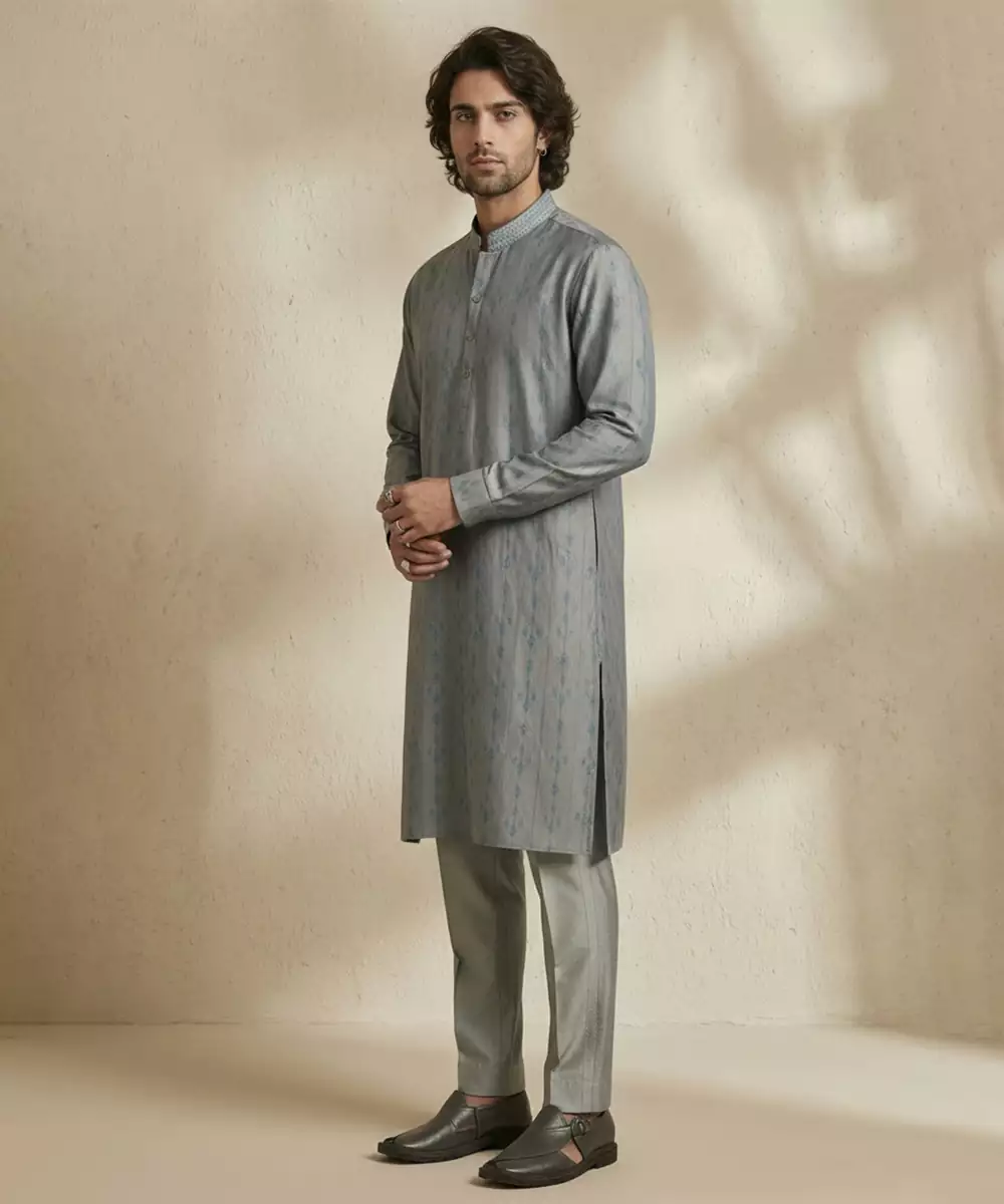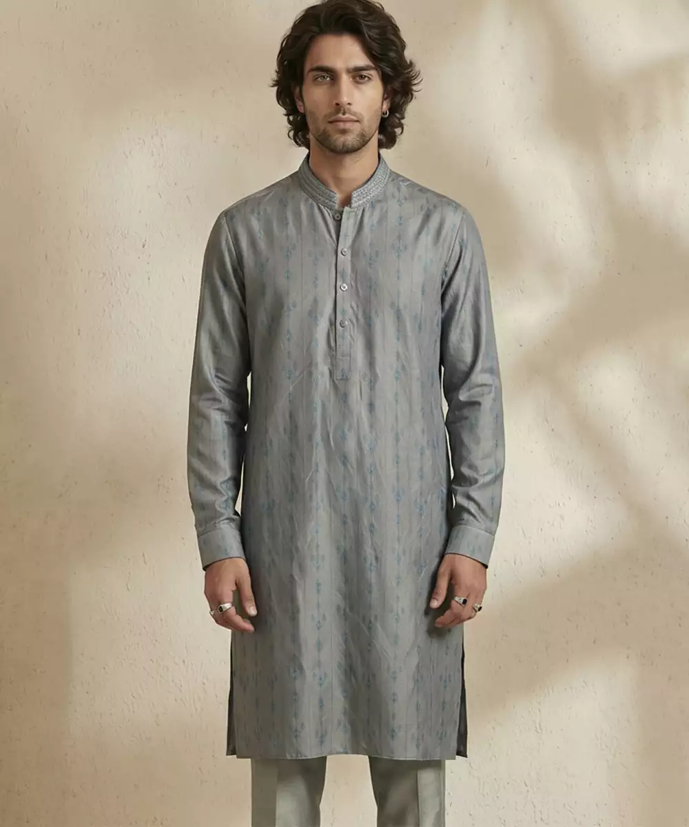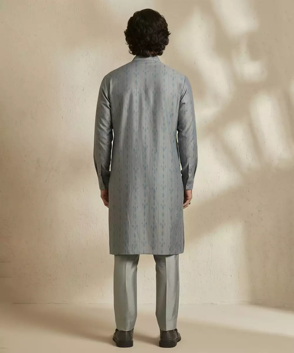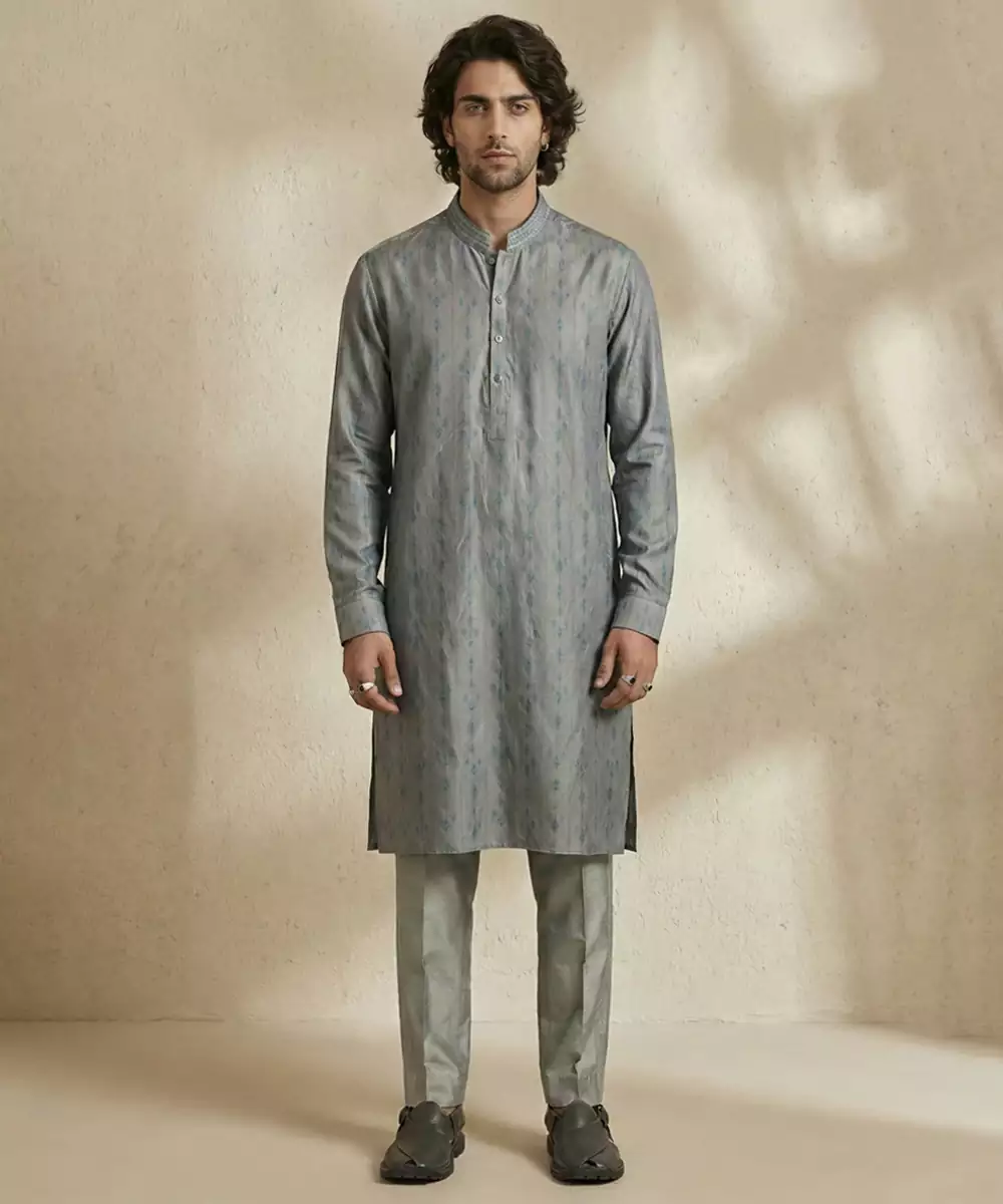 This Grey Woven Silk Kurta Set Exudes Understated Sophistication And Timeless Elegance. Crafted From Premium Woven Silk, The Kurta Features A Subtle Texture That Adds Depth And Charm. Perfect For Weddings, Festive Celebrations, Or Formal Gatherings, It Pairs Seamlessly With Matching Bottoms For A Polished And Graceful Ensemble.