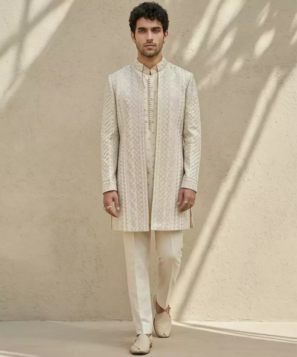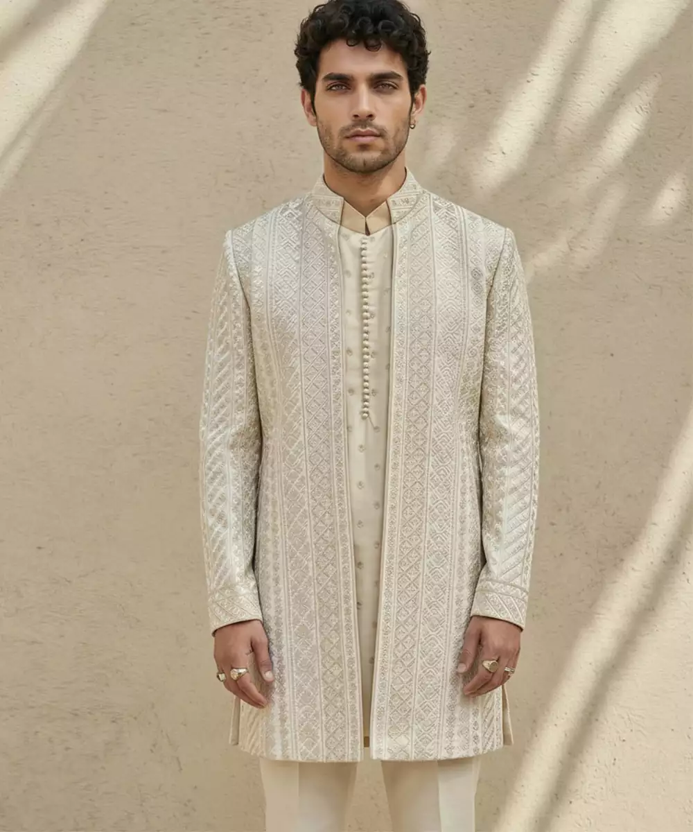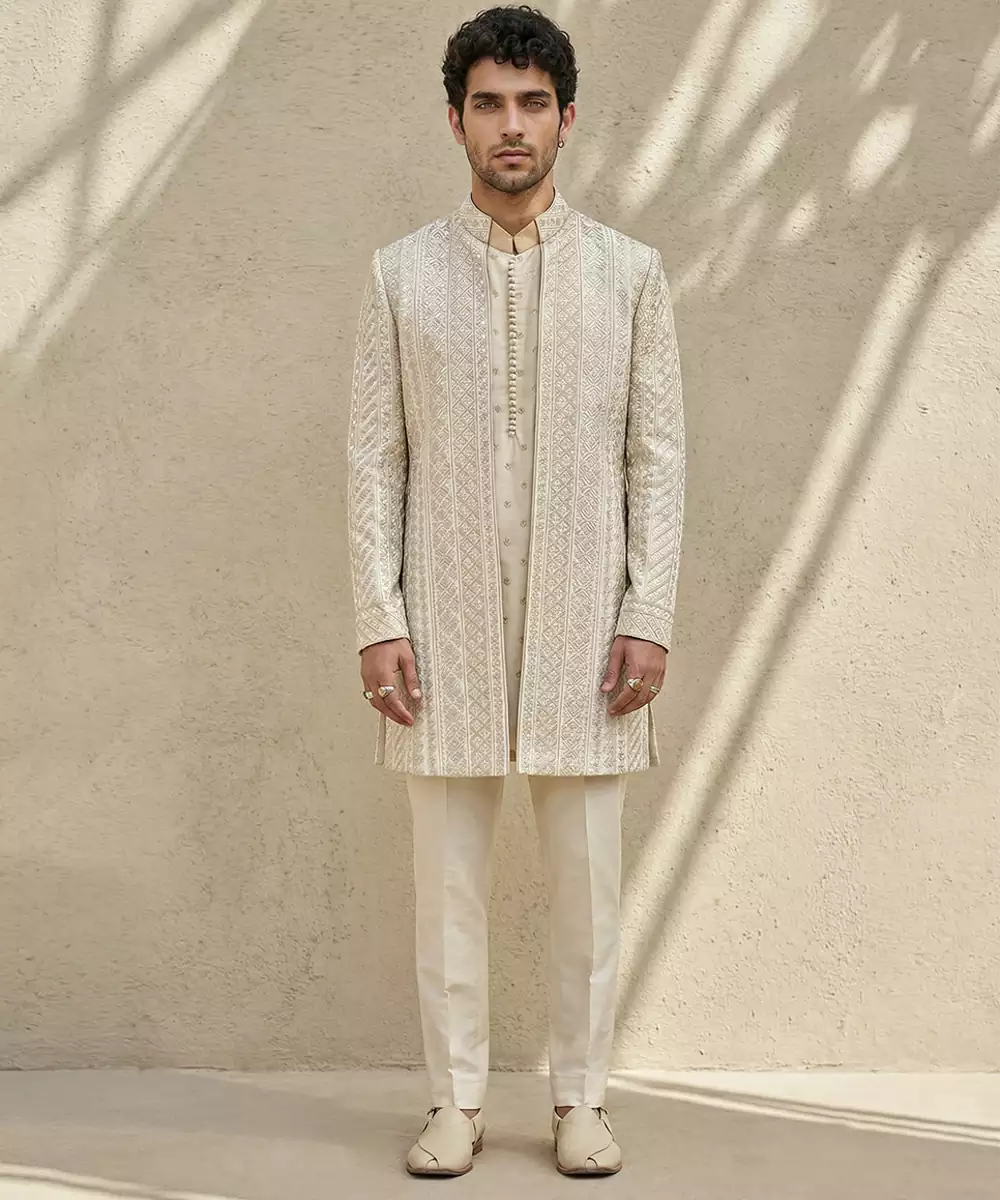 This Ivory Embroidered Silk Sherwani Radiates Regal Elegance And Refined Craftsmanship. Crafted From Luxurious Silk, It Features Intricate Embroidery That Enhances Its Festive And Wedding Ready Appeal. Perfect For Grooms Or Special Occasions, It Pairs Effortlessly With Churidar Or Trousers, Offering A Sophisticated, Graceful, And Timeless Ensemble.