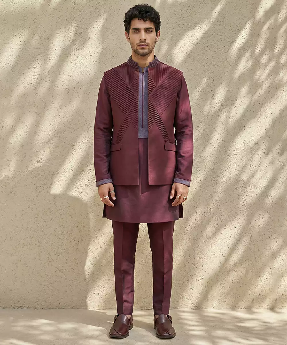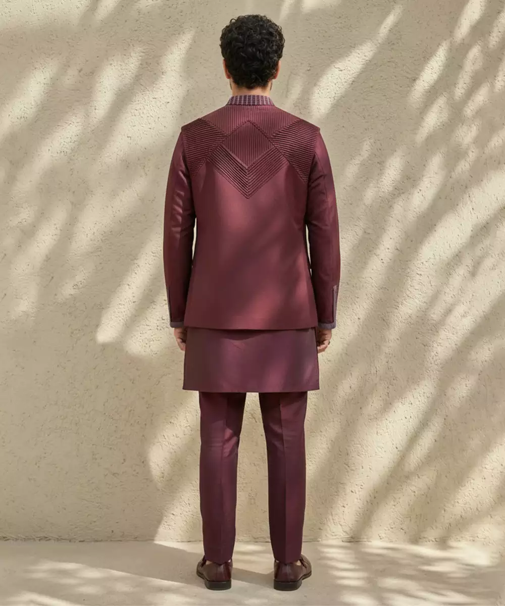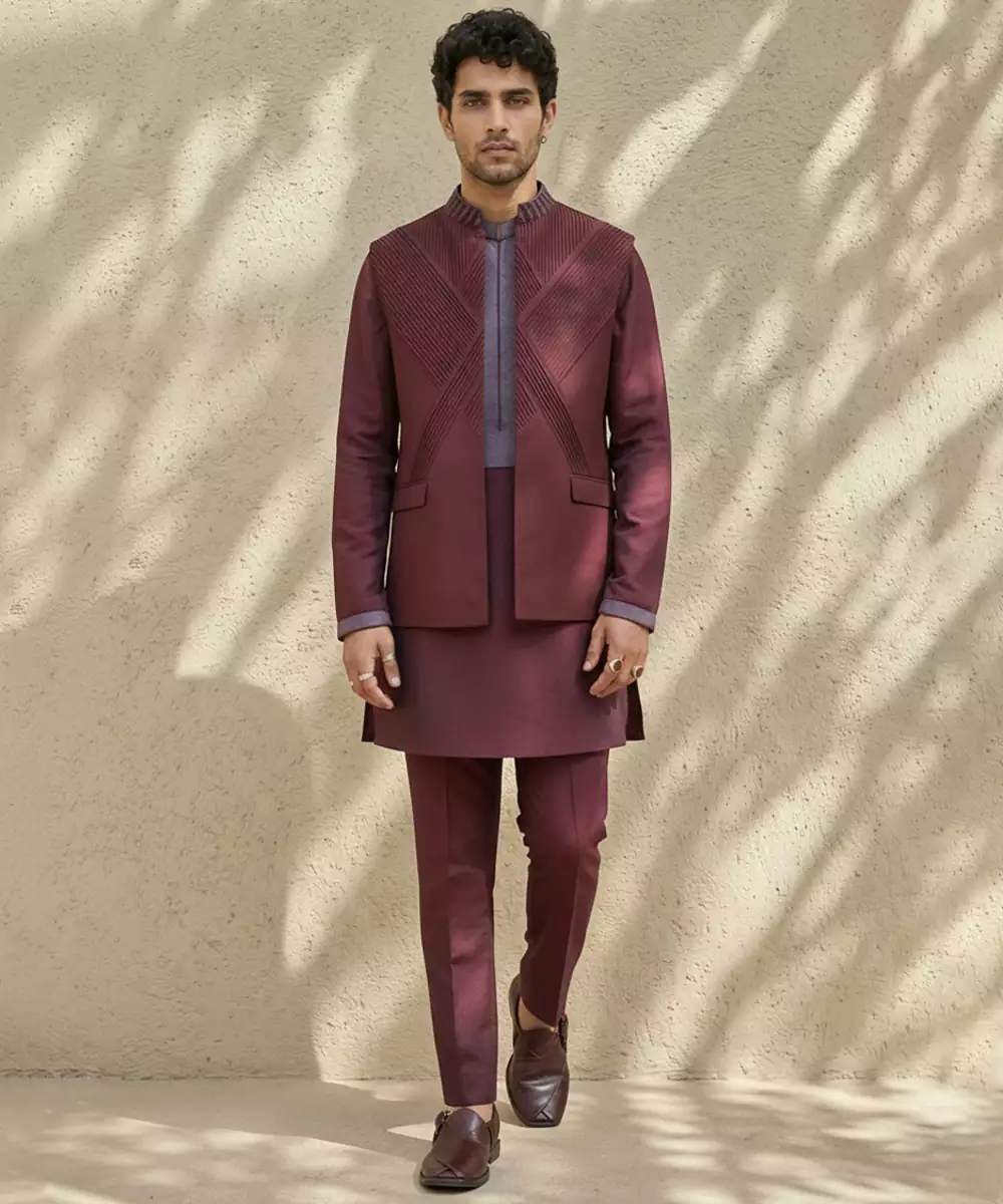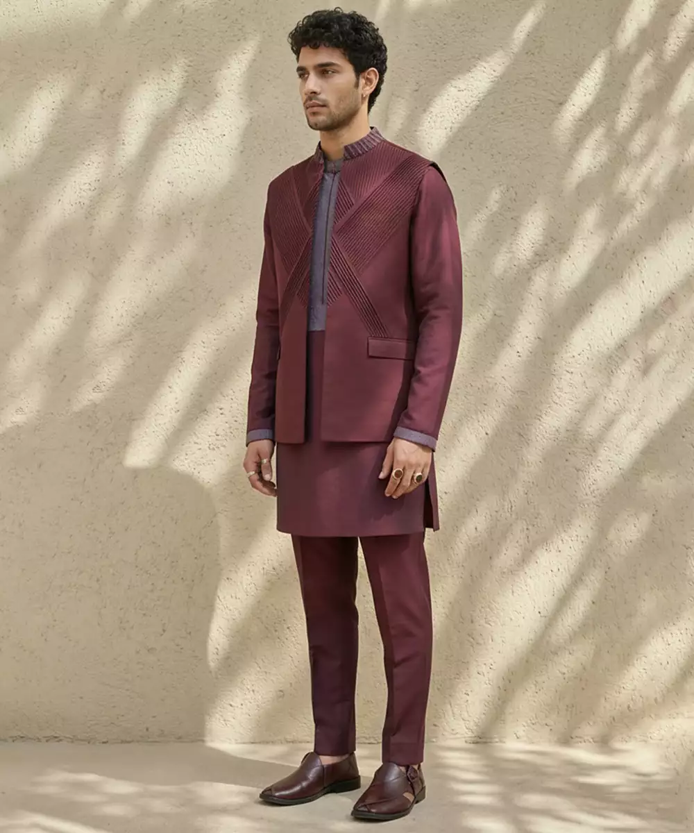 Maroon Embroidered Wool Nehru Jacket Crafted With A Warm, Structured Silhouette And Classic Mandarin Collar. Detailed With Elegant Traditional Embroidery, It Offers Both Comfort And Refined Style. Ideal For Winter Weddings, Festive Occasions, And Formal Ethnic Gatherings When Paired With Kurtas Or Tailored Shirts.