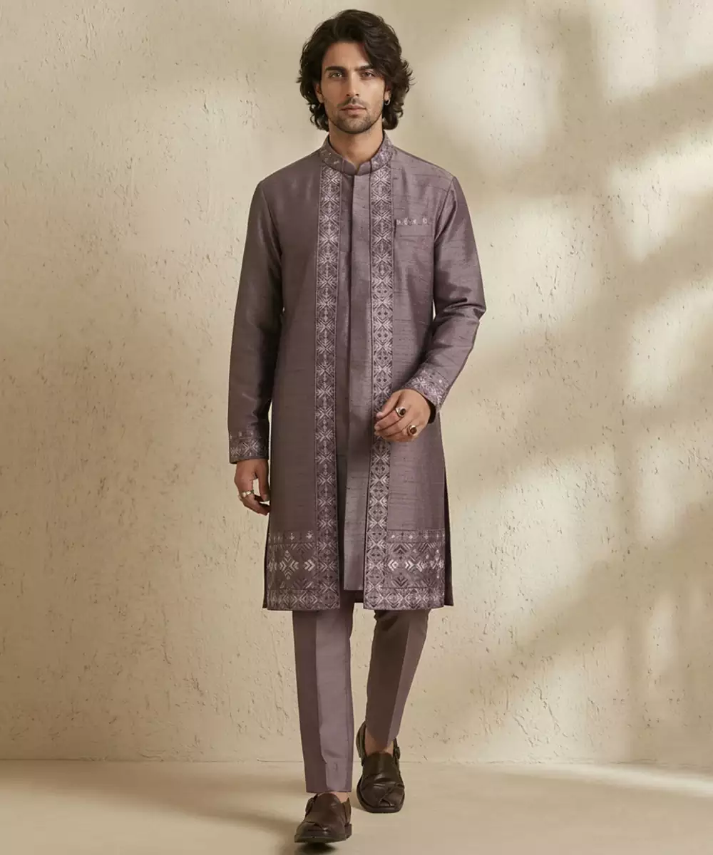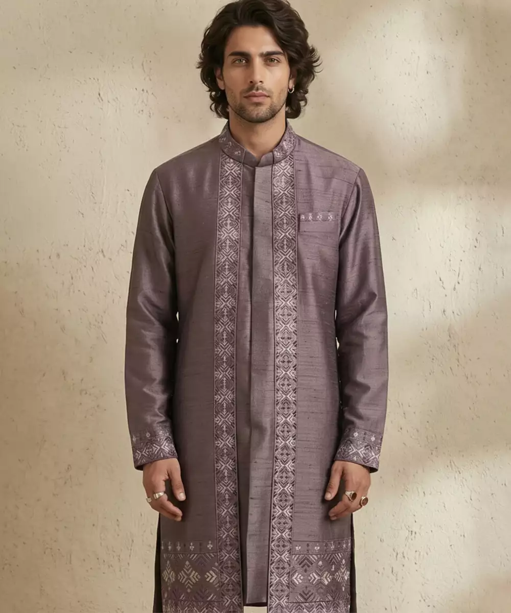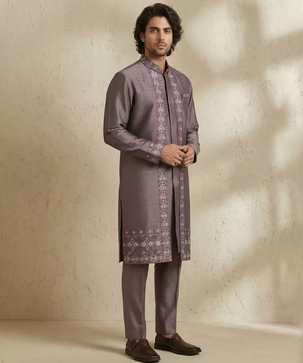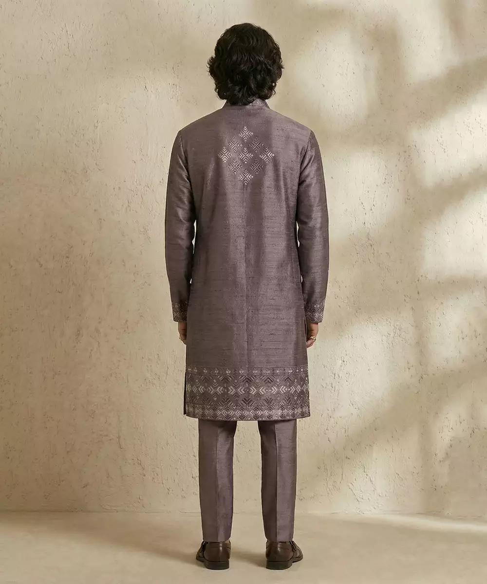 This Purple Embroidered Raw Silk Kurta Set Radiates Regal Charm And Timeless Elegance. Crafted From Luxurious Raw Silk, The Kurta Features Intricate Embroidery That Enhances Its Festive Appeal. Ideal For Weddings, Celebrations, Or Special Occasions, It Pairs Beautifully With Matching Bottoms For A Sophisticated And Graceful Ensemble.