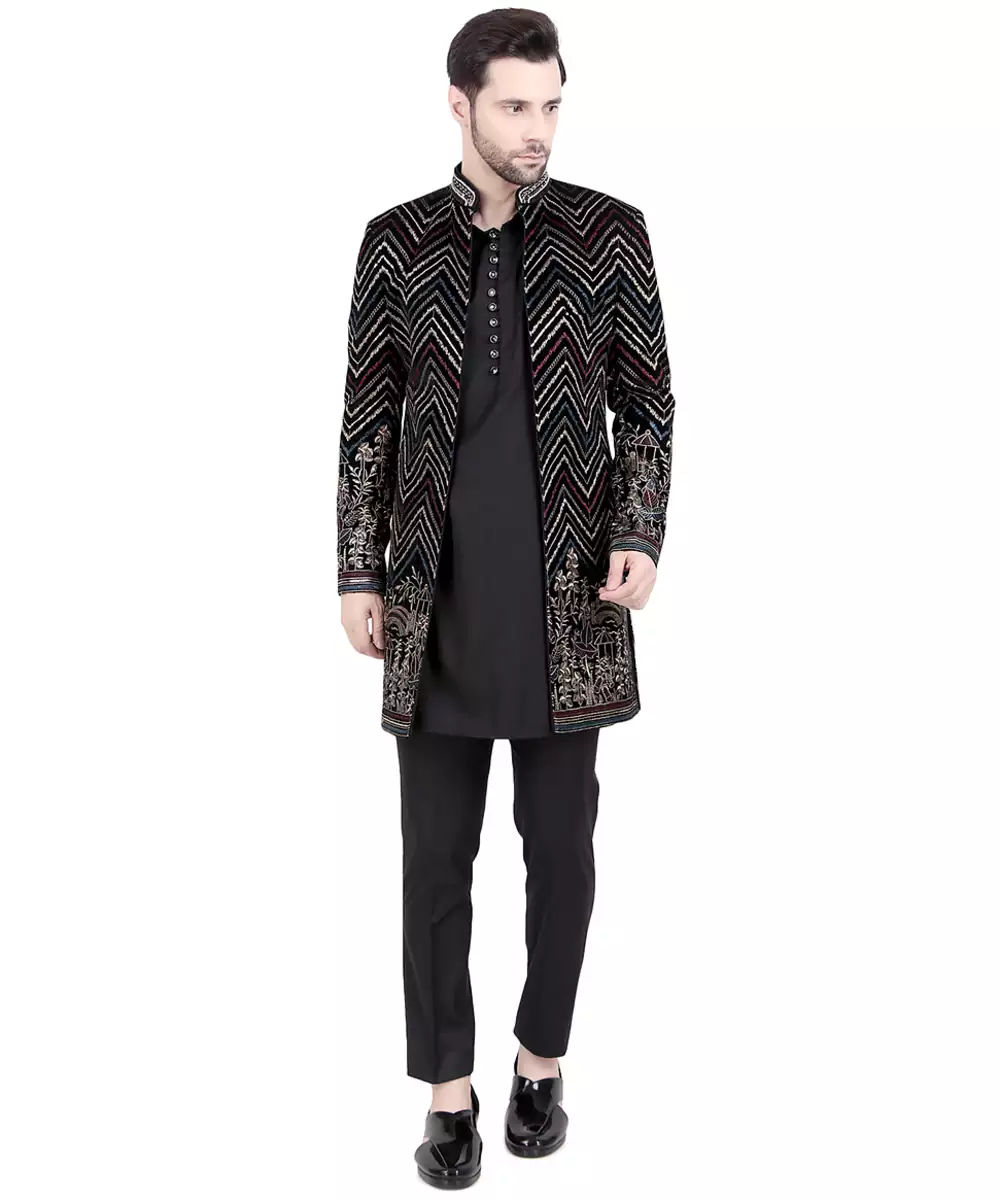 Featuring A Black Indowestern In Velvet Base With Resham Multicolor Embroidery. Perfect Attire For A Wedding Or Engagement Ceremony.