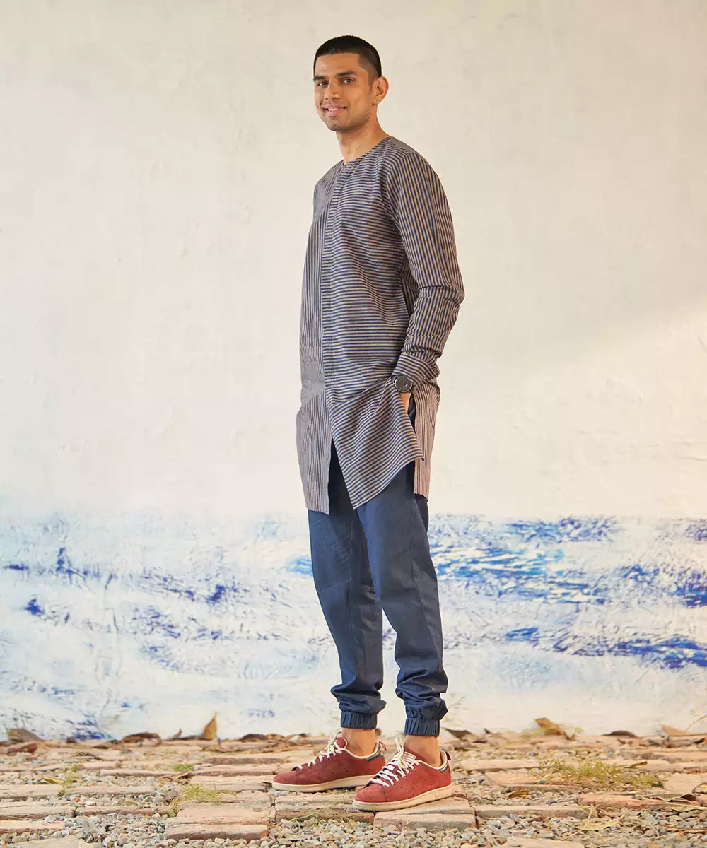 Perfect For The Confident Leisurely Cruiser With A Penchant For Stylish Kurta Outfits. This Piece Is Bound To Become A Staple In Your Everyday Wardrobe. The Kurta Exudes A Distinctive Sharpness, Boasting A Unique No Collar Design With A Stylish Long Placket Concealing The Buttons Within. Adorned With An Interplay Of Horizontal Stripes And Featuring Both Front And Side Long Slits, This Kurta Seamlessly Combines Traditional Drapery With A Modern Twist, Allowing You To Make A Bold Statement Wherever You Go.