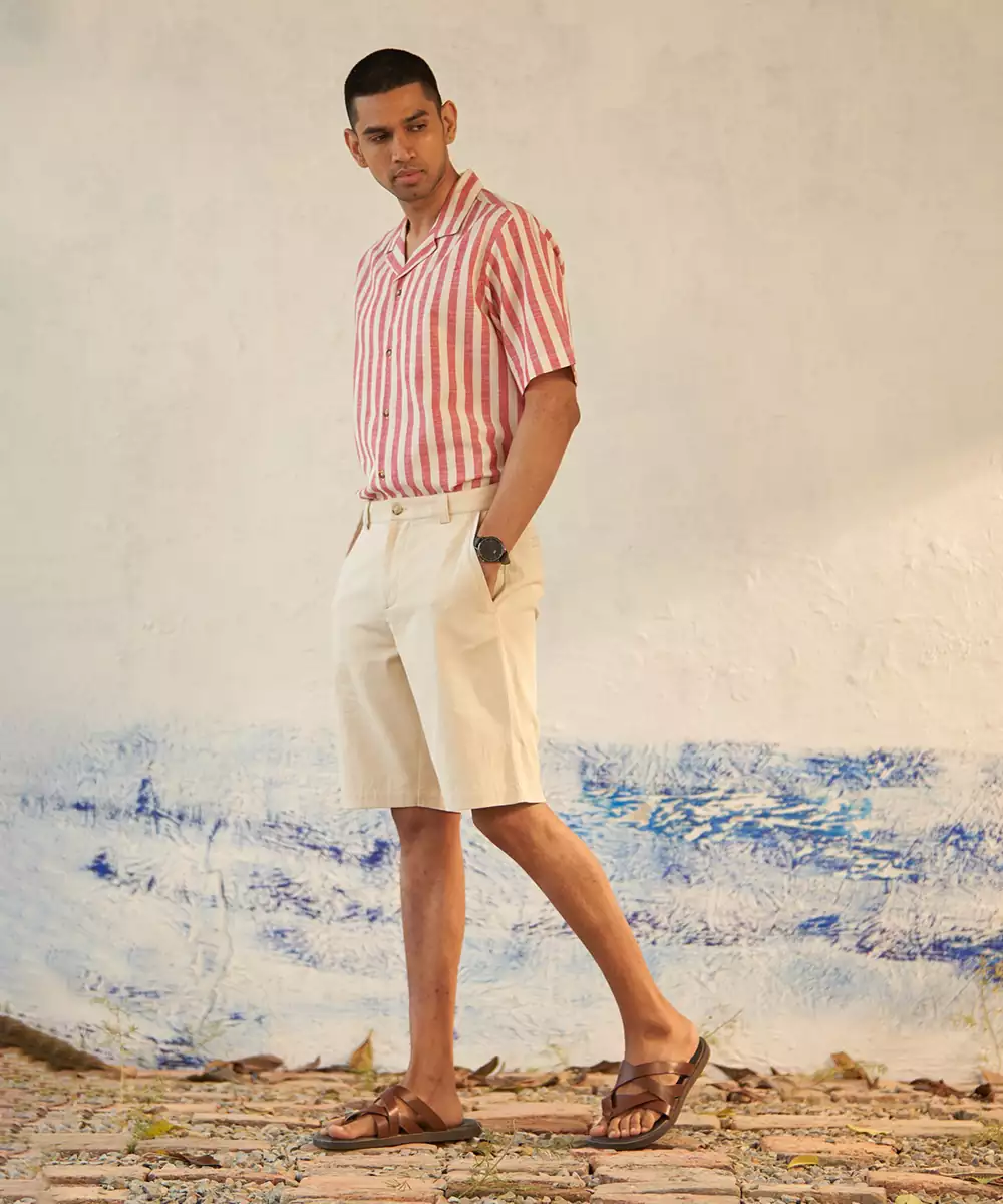 The Short Sleeved Shirt With A Camp Collar Exudes A Laid Back Yet Refined Vibe, Accentuated By Stripes On The Pocket. Crafted From Textured Cotton, It Ensures Comfort On Leisurely Explorations. Paired With European Alley Shorts, Featuring Convenient Pockets And A Comfortable Cotton Twill Fabric. Together, The Shirt And Shorts Offer A Laid Back Yet Refined Ensemble That's Suitable For Various Occasions, Whether You're Strolling Through Cobblestone Streets Or Enjoying A Café In A New City.