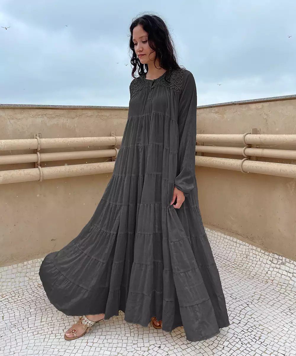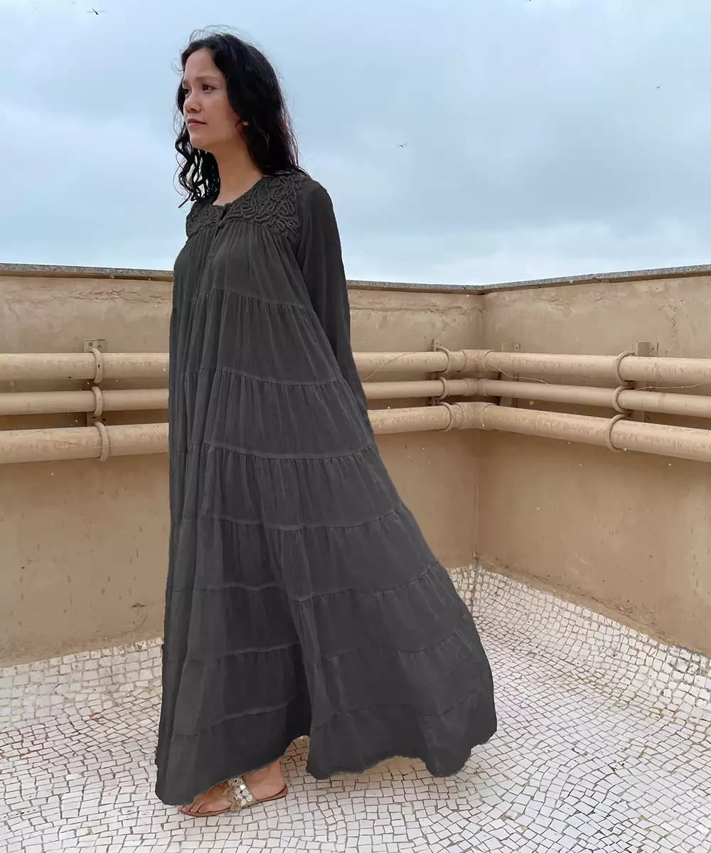 Ghera Dress With Voluminous Free Flowing Fabric And Couching Embroidery.
