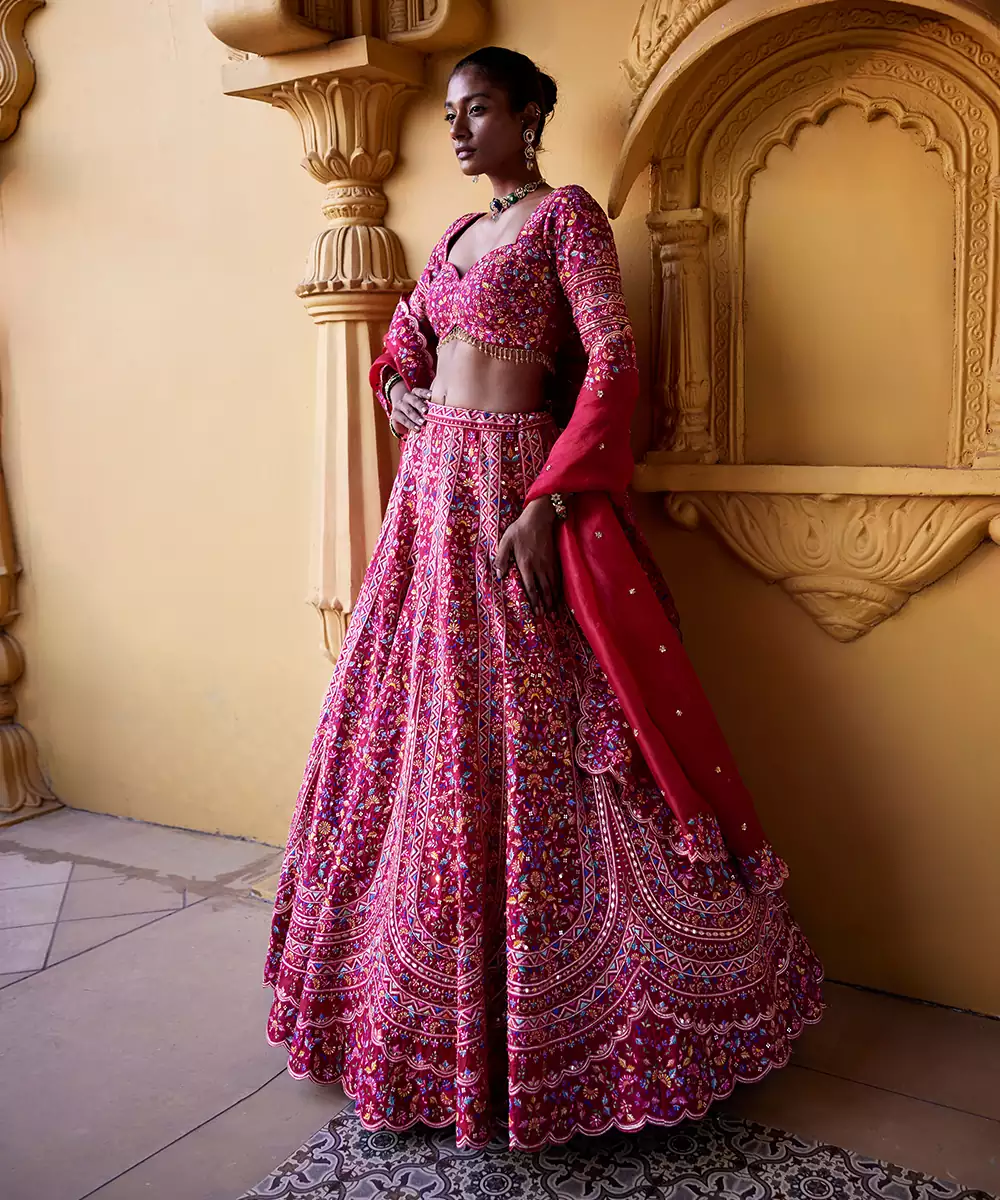 Alicia Lehenga Set Featuring Thread Embroidery With Touch Of Gold Lehenga Paired With Elbow Sleeve Raw Silk Blouse And Organza Dupatta With Embroidered Borders.
