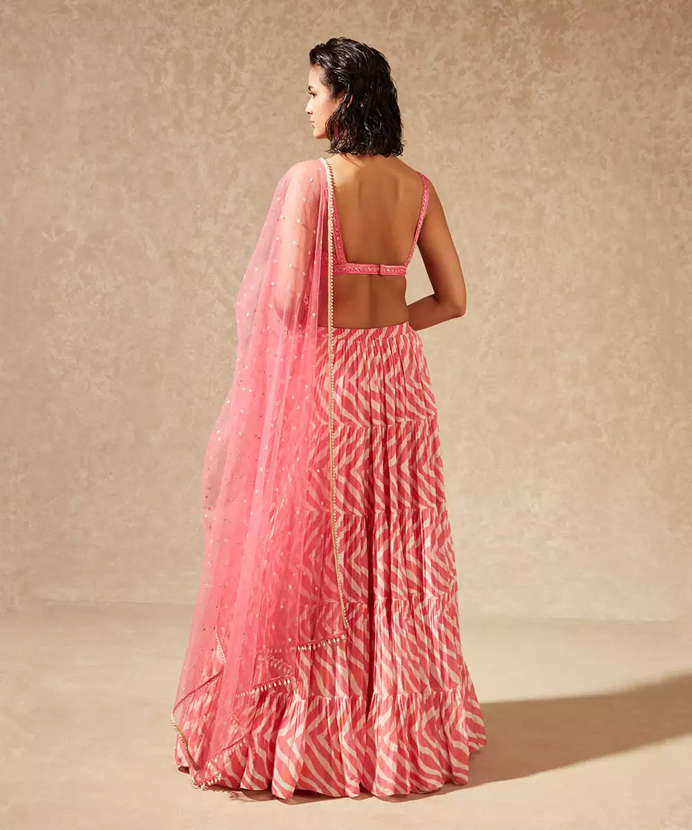 Georgette Chevron Print Tiered Skirt, Paired With A Silk Hand Embroidered Blouse And Tulle Dupatta.