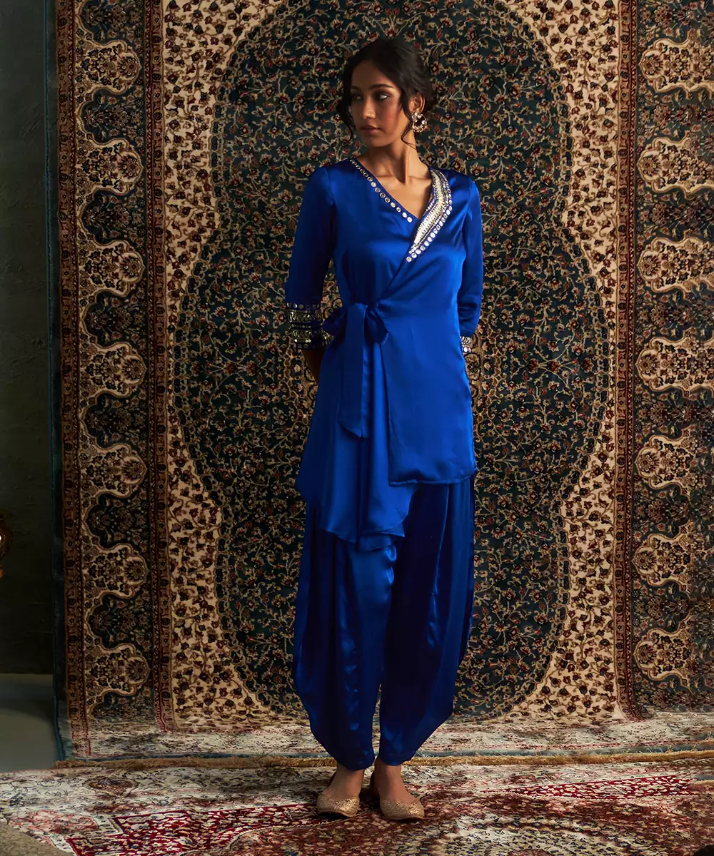 The Blue Wrap Kurta Is A Sophisticated And Versatile Statement Piece, Showcasing Intricate Embroidery On The Lapel For An Elegant Touch. Its Adjustable Design Ensures A Flattering Fit For All Body Types, Offering Both Style And Comfort. Paired With Flowy Cowl Bottoms, This Ensemble Seamlessly Blends Traditional Craftsmanship With Contemporary Flair, Creating A Bold Yet Harmonious Look.