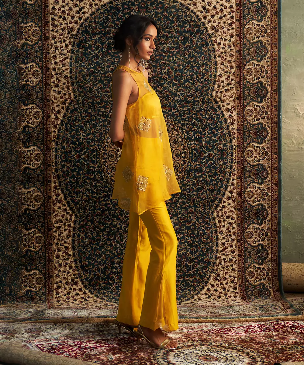 Marigold Sleeveless A Line Sheer Kurta. Crafted From Luxurious Organza Fabric, It Showcases Intricate Dabka And Zari Embroidery, Adding A Hint Of Opulence And Regal Charm. Paired With A Sleek Tube Bustier And Chic Boot Cut Trousers, This Ensemble Strikes The Perfect Balance Between Timeless Elegance And Modern Flair. Ideal For Festive Occasions And Sophisticated Gatherings Alike, This Kurta Promises A Stunning Entrance, Blending Grace, Allure, And Contemporary Fashion With Ease.