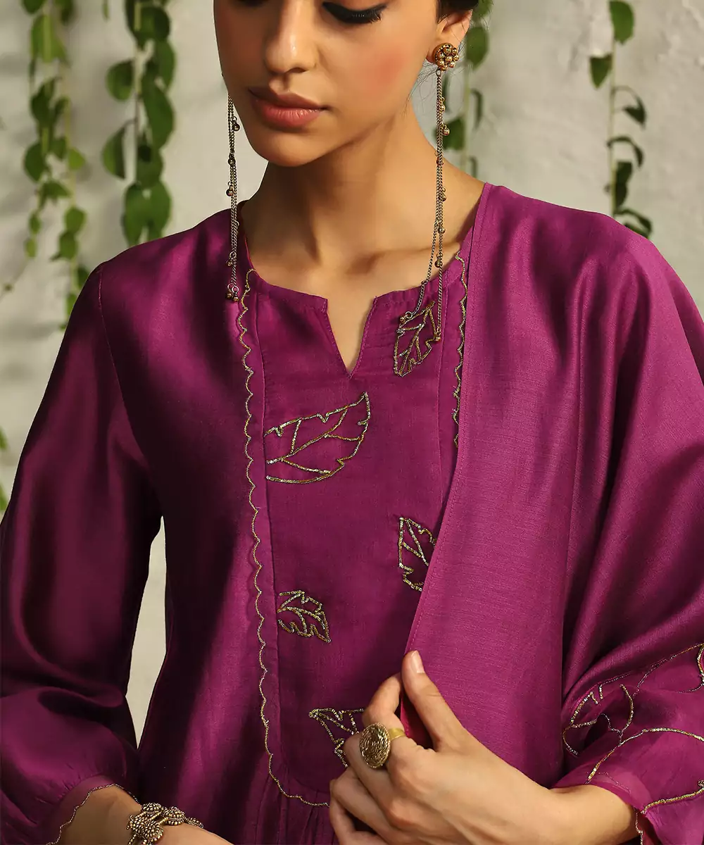 The Timelessness Of Nature Inspired Motifs Is Interpreted Through Hand Embroidered Leaf Motifs In Our Pop Pink Relaxed Fit Kurta Set. The Decadence Is Enhanced With Our Intricate Nakshi And Zari Work. A Beautiful Nakshi Work Organza Cut Out Chanderi Dupatta And Scalloped Edged Narrow Pants Lend A Glamorous Touch To The Overall Look.