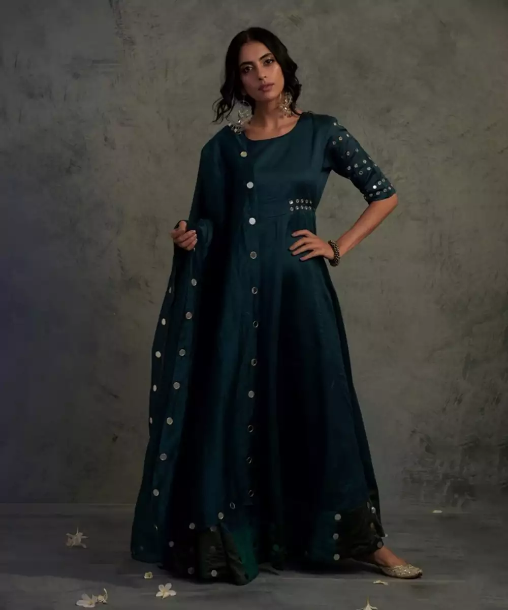 Chanderi Anarkali In Teal Blue Color. This Anarkali Set Is Adorned With Mirror Work On Sleeves, Waistline And Border And Is Paired With A Chanderi Dupatta Embroidered With Mirror Work On Borders. Get Into The Festive Mode With This Beautiful Dress.