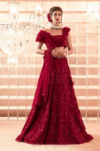 Lehenga In Ox Blood Colour With Cutdana And Bead Embroidered Motifs. It Is Paired With A Sleeveless Silk Blouse Having Surplice Neckline And A Net Dupatta.