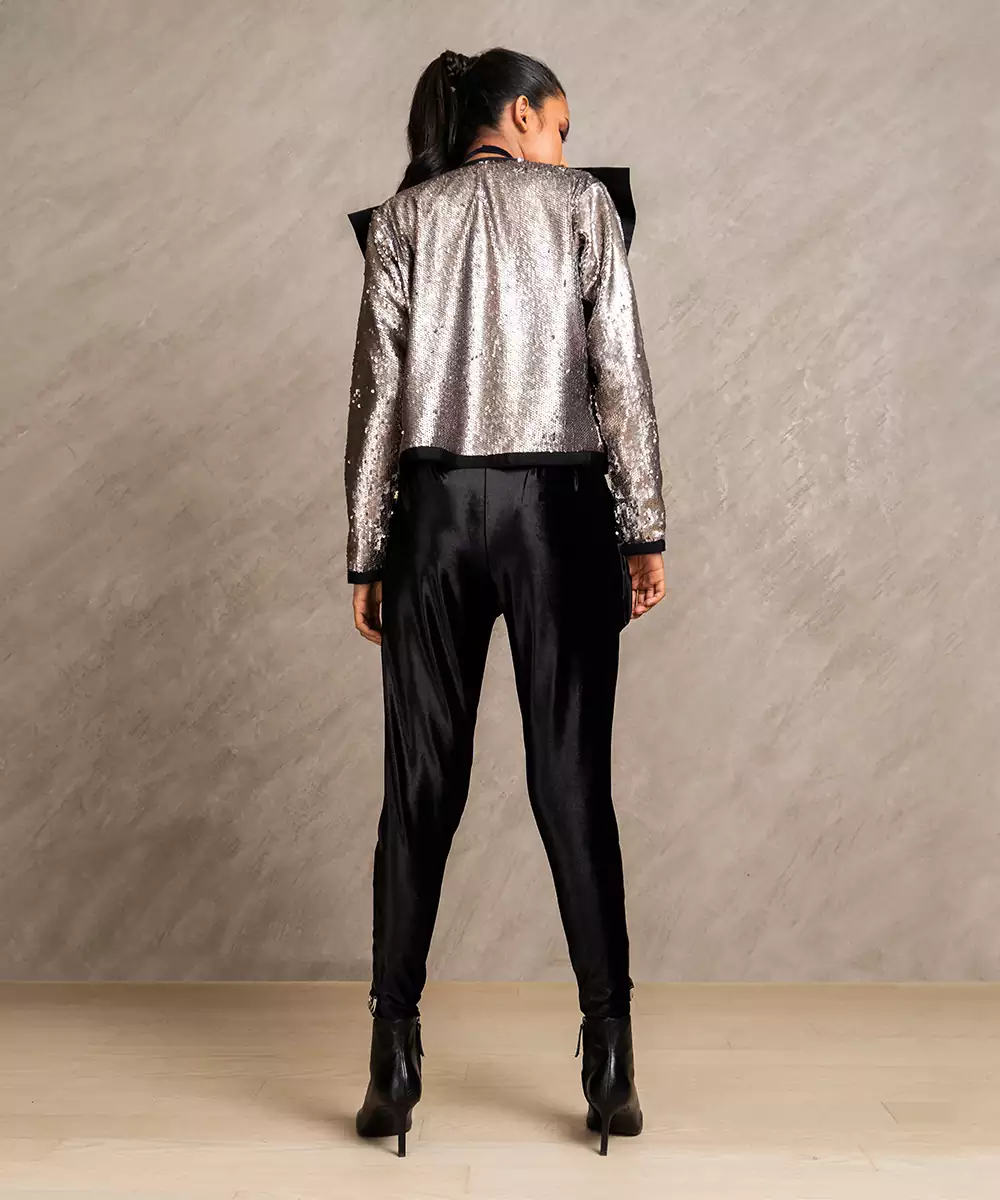 Prepare To Dazzle In Our Beautifully Crafted Sequin Jacket With Oversized Satin Lapels Featuring Adjustable Waist Fasten Hooks In Black With Imported Ribbon Finishing And Black Satin Lining Inside.Complete Your Glamourous Diva Look With Lilith Pants .